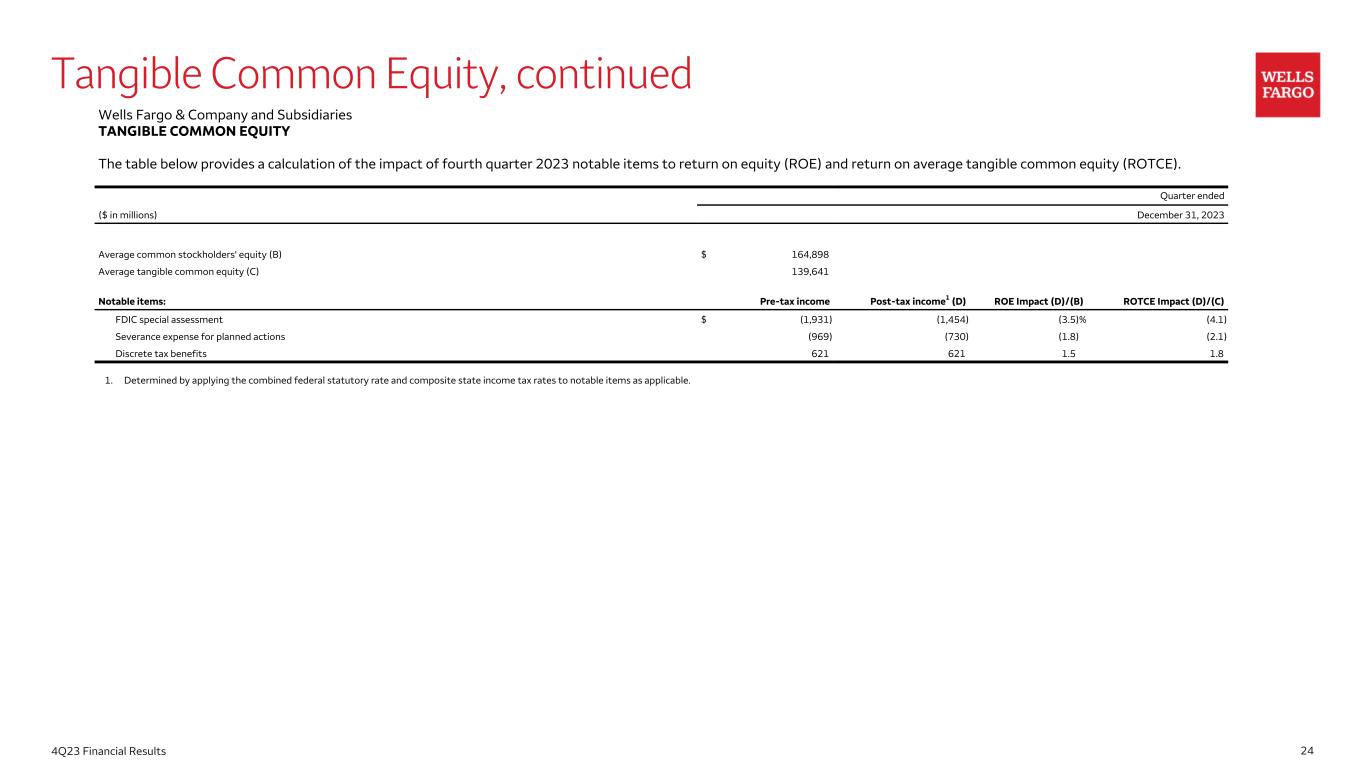244Q23 Financial Results Tangible Common Equity, continued Wells Fargo & Company and Subsidiaries TANGIBLE COMMON EQUITY The table below provides a calculation of the impact of fourth quarter 2023 notable items to return on equity (ROE) and return on average tangible common equity (ROTCE). Quarter ended ($ in millions) December 31, 2023 Average common stockholders' equity (B) $ 164,898 Average tangible common equity (C) 139,641 Notable items: Pre-tax income Post-tax income1 (D) ROE Impact (D)/(B) ROTCE Impact (D)/(C) FDIC special assessment $ (1,931) (1,454) (3.5) % (4.1) Severance expense for planned actions (969) (730) (1.8) (2.1) Discrete tax benefits 621 621 1.5 1.8 1. Determined by applying the combined federal statutory rate and composite state income tax rates to notable items as applicable.