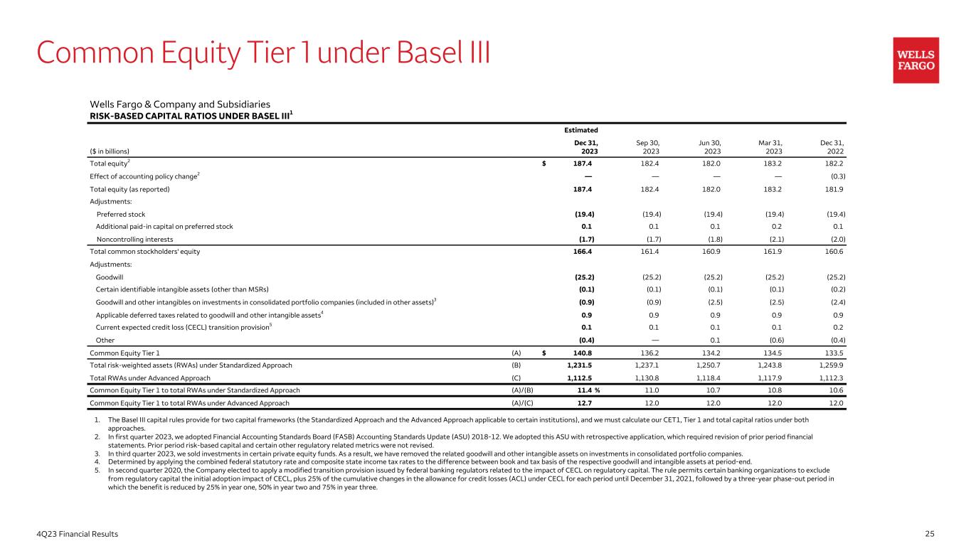254Q23 Financial Results 1. The Basel III capital rules provide for two capital frameworks (the Standardized Approach and the Advanced Approach applicable to certain institutions), and we must calculate our CET1, Tier 1 and total capital ratios under both approaches. 2. In first quarter 2023, we adopted Financial Accounting Standards Board (FASB) Accounting Standards Update (ASU) 2018-12. We adopted this ASU with retrospective application, which required revision of prior period financial statements. Prior period risk-based capital and certain other regulatory related metrics were not revised. 3. In third quarter 2023, we sold investments in certain private equity funds. As a result, we have removed the related goodwill and other intangible assets on investments in consolidated portfolio companies. 4. Determined by applying the combined federal statutory rate and composite state income tax rates to the difference between book and tax basis of the respective goodwill and intangible assets at period-end. 5. In second quarter 2020, the Company elected to apply a modified transition provision issued by federal banking regulators related to the impact of CECL on regulatory capital. The rule permits certain banking organizations to exclude from regulatory capital the initial adoption impact of CECL, plus 25% of the cumulative changes in the allowance for credit losses (ACL) under CECL for each period until December 31, 2021, followed by a three-year phase-out period in which the benefit is reduced by 25% in year one, 50% in year two and 75% in year three. Common Equity Tier 1 under Basel III Wells Fargo & Company and Subsidiaries RISK-BASED CAPITAL RATIOS UNDER BASEL III1 Estimated ($ in billions) Dec 31, 2023 Sep 30, 2023 Jun 30, 2023 Mar 31, 2023 Dec 31, 2022 Total equity2 $ 187.4 182.4 182.0 183.2 182.2 Effect of accounting policy change2 — — — — (0.3) Total equity (as reported) 187.4 182.4 182.0 183.2 181.9 Adjustments: Preferred stock (19.4) (19.4) (19.4) (19.4) (19.4) Additional paid-in capital on preferred stock 0.1 0.1 0.1 0.2 0.1 Noncontrolling interests (1.7) (1.7) (1.8) (2.1) (2.0) Total common stockholders' equity 166.4 161.4 160.9 161.9 160.6 Adjustments: Goodwill (25.2) (25.2) (25.2) (25.2) (25.2) Certain identifiable intangible assets (other than MSRs) (0.1) (0.1) (0.1) (0.1) (0.2) Goodwill and other intangibles on investments in consolidated portfolio companies (included in other assets)3 (0.9) (0.9) (2.5) (2.5) (2.4) Applicable deferred taxes related to goodwill and other intangible assets4 0.9 0.9 0.9 0.9 0.9 Current expected credit loss (CECL) transition provision5 0.1 0.1 0.1 0.1 0.2 Other (0.4) — 0.1 (0.6) (0.4) Common Equity Tier 1 (A) $ 140.8 136.2 134.2 134.5 133.5 Total risk-weighted assets (RWAs) under Standardized Approach (B) 1,231.5 1,237.1 1,250.7 1,243.8 1,259.9 Total RWAs under Advanced Approach (C) 1,112.5 1,130.8 1,118.4 1,117.9 1,112.3 Common Equity Tier 1 to total RWAs under Standardized Approach (A)/(B) 11.4 % 11.0 10.7 10.8 10.6 Common Equity Tier 1 to total RWAs under Advanced Approach (A)/(C) 12.7 12.0 12.0 12.0 12.0