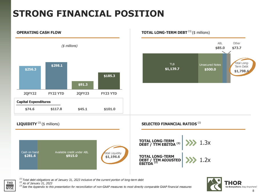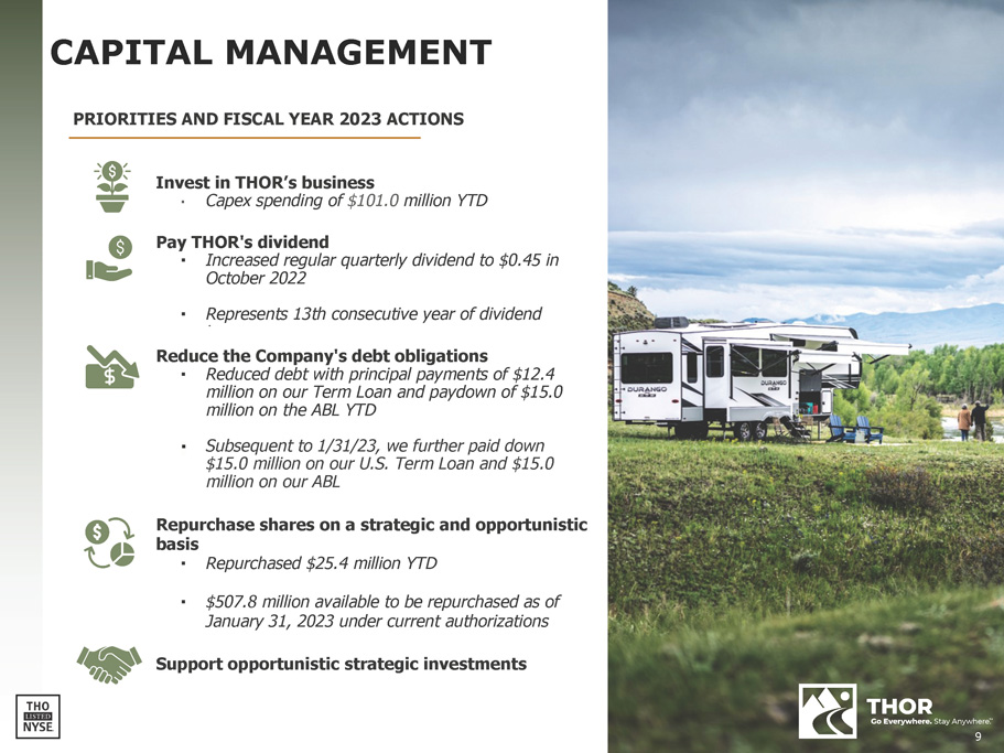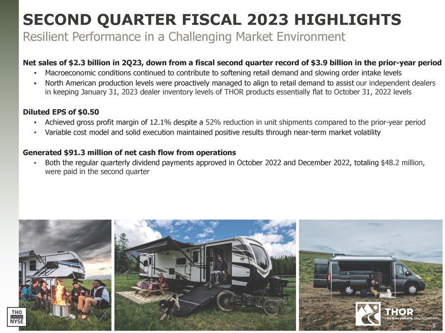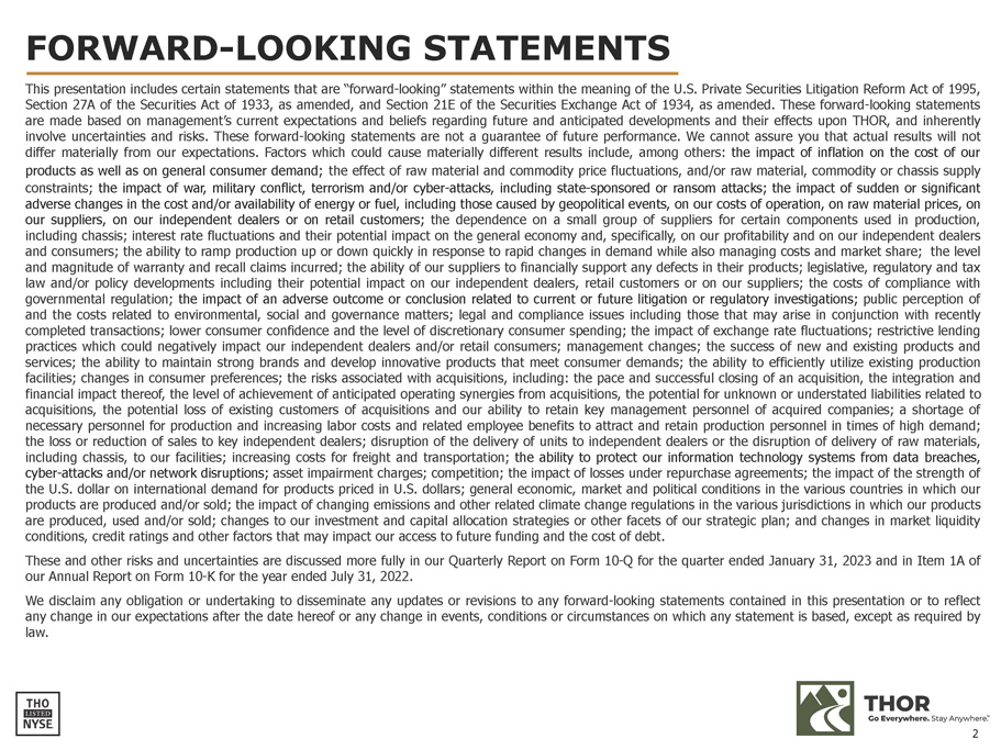 FORWARD - LOOKING STATEMENTS This presentation includes certain statements that are “forward - looking” statements within the meaning of the U . S . Private Securities Litigation Reform Act of 1995 , Section 27 A of the Securities Act of 1933 , as amended, and Section 21 E of the Securities Exchange Act of 1934 , as amended . These forward - looking statements are made based on management’s current expectations and beliefs regarding future and anticipated developments and their effects upon THOR, and inherently involve uncertainties and risks . These forward - looking statements are not a guarantee of future performance . We cannot assure you that actual results will not differ materially from our expectations . Factors which could cause materially different results include, among others : the impact of inflation on the cost of our products as well as on general consumer demand ; the effect of raw material and commodity price fluctuations, and/or raw material, commodity or chassis supply constraints ; the impact of war, military conflict, terrorism and/or cyber - attacks, including state - sponsored or ransom attacks ; the impact of sudden or significant adverse changes in the cost and/or availability of energy or fuel, including those caused by geopolitical events, on our costs of operation, on raw material prices, on our suppliers, on our independent dealers or on retail customers ; the dependence on a small group of suppliers for certain components used in production, including chassis ; interest rate fluctuations and their potential impact on the general economy and, specifically, on our profitability and on our independent dealers and consumers ; the ability to ramp production up or down quickly in response to rapid changes in demand while also managing costs and market share ; the level and magnitude of warranty and recall claims incurred ; the ability of our suppliers to financially support any defects in their products ; legislative, regulatory and tax law and/or policy developments including their potential impact on our independent dealers, retail customers or on our suppliers ; the costs of compliance with governmental regulation ; the impact of an adverse outcome or conclusion related to current or future litigation or regulatory investigations ; public perception of and the costs related to environmental, social and governance matters ; legal and compliance issues including those that may arise in conjunction with recently completed transactions ; lower consumer confidence and the level of discretionary consumer spending ; the impact of exchange rate fluctuations ; restrictive lending practices which could negatively impact our independent dealers and/or retail consumers ; management changes ; the success of new and existing products and services ; the ability to maintain strong brands and develop innovative products that meet consumer demands ; the ability to efficiently utilize existing production facilities ; changes in consumer preferences ; the risks associated with acquisitions, including : the pace and successful closing of an acquisition, the integration and financial impact thereof, the level of achievement of anticipated operating synergies from acquisitions, the potential for unknown or understated liabilities related to acquisitions, the potential loss of existing customers of acquisitions and our ability to retain key management personnel of acquired companies ; a shortage of necessary personnel for production and increasing labor costs and related employee benefits to attract and retain production personnel in times of high demand ; the loss or reduction of sales to key independent dealers ; disruption of the delivery of units to independent dealers or the disruption of delivery of raw materials, including chassis, to our facilities ; increasing costs for freight and transportation ; the ability to protect our information technology systems from data breaches, cyber - attacks and/or network disruptions ; asset impairment charges ; competition ; the impact of losses under repurchase agreements ; the impact of the strength of the U . S . dollar on international demand for products priced in U . S . dollars ; general economic, market and political conditions in the various countries in which our products are produced and/or sold ; the impact of changing emissions and other related climate change regulations in the various jurisdictions in which our products are produced, used and/or sold ; changes to our investment and capital allocation strategies or other facets of our strategic plan ; and changes in market liquidity conditions, credit ratings and other factors that may impact our access to future funding and the cost of debt . These and other risks and uncertainties are discussed more fully in our Quarterly Report on Form 10 - Q for the quarter ended January 31 , 2023 and in Item 1 A of our Annual Report on Form 10 - K for the year ended July 31 , 2022 . We disclaim any obligation or undertaking to disseminate any updates or revisions to any forward - looking statements contained in this presentation or to reflect any change in our expectations after the date hereof or any change in events, conditions or circumstances on which any statement is based, except as required by law . 2