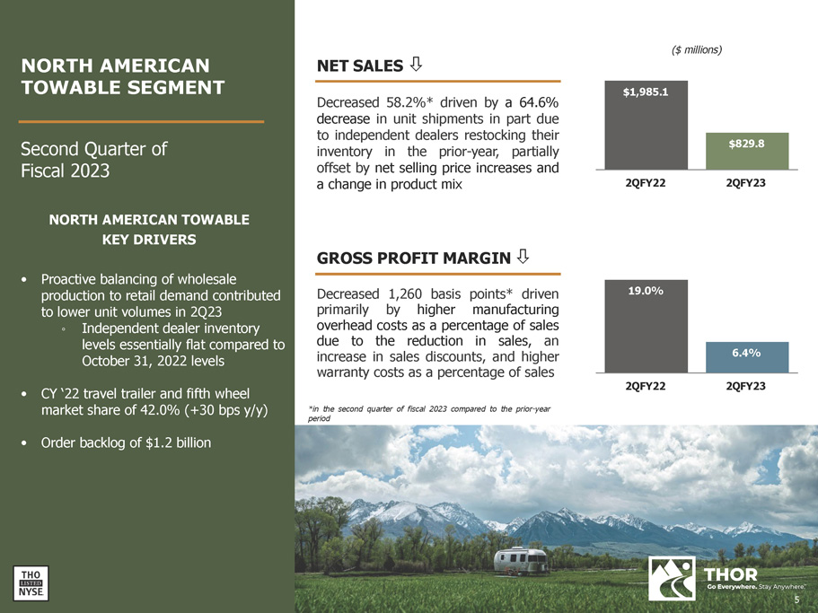 $948.1 $5,253.6 $10,442.9 $1,153.0 $639.9 $812.0 $784.4 $2,916.4 $4,232.5 $1,848.1 $1,142.0 $2,644.2 $3,051.5 $3,055.7 NA Towables NA Motorized European (3) Includes Tiffin backlog subsequent to the December 2020 acquisition of the Tiffin Group 01/31/19 01/31/20 01/31/21 European $0.65 bn 27.6% NA Motorized $0.74 bn 31.5% NA Towables $0.83 bn 35.4% Other $0.13 bn 5.5% 137,900 115,200 78,100 112,000 121,300 1/31/19 1/31/20 NORTH AMERICAN INDEPENDENT DEALER INVENTORY OF THOR PRODUCTS RV BACKLOG OF $6.06 BILLION (65.8)% Inventory Units (2) Includes units of Tiffin products subsequent to the December 2020 acquisition of the Tiffin Group (2) 1/31/23 (2) 1/31/22 01/31/23 (3) 01/31/22 (3) (2) 1/31/21 (1) As compared to the second quarter of fiscal year 2022 SECOND QUARTER OF FISCAL YEAR 2023 Gross Margin 12.1% - 530 bps (1) Diluted EPS $0.50 (89.6)% (1) Net Sales $2.3 billion (39.4)% (1) Unit Shipments 37,960 (51.6)% (1) 4 (3)