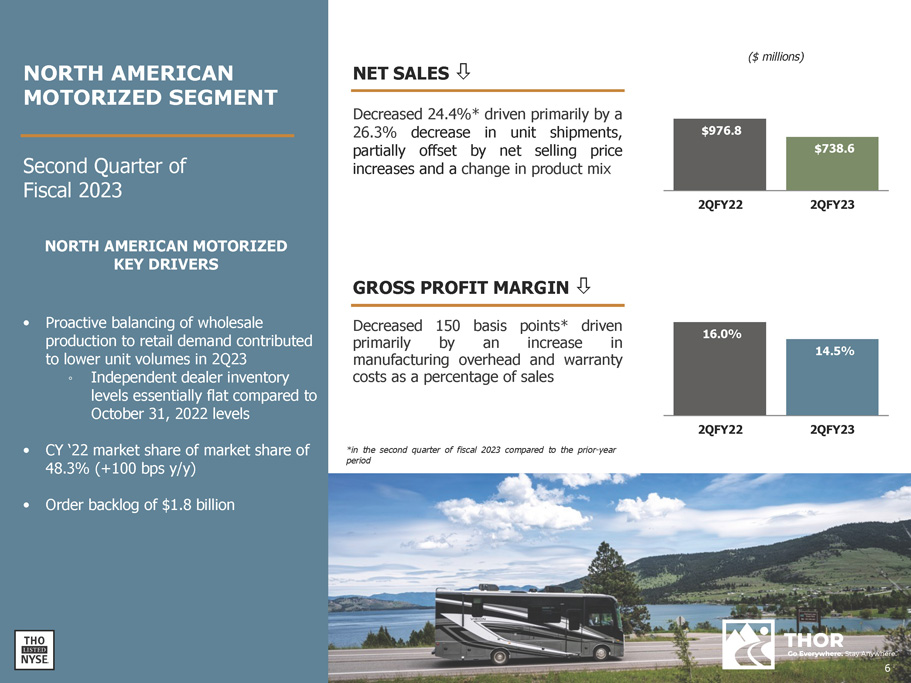 ($ millions) $1,985.1 $829.8 2QFY22 2QFY23 19.0% 6.4% 2QFY22 2QFY23 NET SALES  Decreased 58 . 2 % * driven by a 64 . 6 % decrease in unit shipments in part due to independent dealers restocking their inventory in the prior - year, partially offset by net selling price increases and a change in product mix GROSS PROFIT MARGIN  Decreased 1 , 260 basis points* driven primarily by higher manufacturing overhead costs as a percentage of sales due to the reduction in sales, an increase in sales discounts, and higher warranty costs as a percentage of sales Second Quarter of Fiscal 2023 NORTH AMERICAN TOWABLE KEY DRIVERS • Proactive balancing of wholesale production to retail demand contributed to lower unit volumes in 2Q23 ◦ Independent dealer inventory levels essentially flat compared to October 31, 2022 levels • CY ‘22 travel trailer and fifth wheel market share of 42.0% (+30 bps y/y) • Order backlog of $1.2 billion *in the second quarter of fiscal 2023 compared to the prior - year period NORTH AMERICAN TOWABLE SEGMENT 5