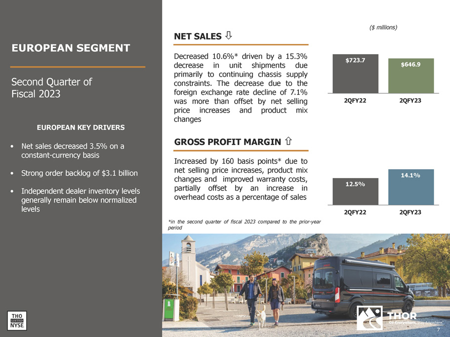 EUROPEAN KEY DRIVERS • Net sales decreased 3.5% on a constant - currency basis • Strong order backlog of $3.1 billion • Independent dealer inventory levels generally remain below normalized levels NET SALES  Decreased 10 . 6 % * driven by a 15 . 3 % decrease in unit shipments due primarily to continuing chassis supply constraints . The decrease due to the foreign exchange rate decline of 7 . 1 % was more than offset by net selling price increases and product mix changes GROSS PROFIT MARGIN  Increased by 160 basis points* due to net selling price increases, product mix changes and improved warranty costs, partially offset by an increase in overhead costs as a percentage of sales ($ millions) $723.7 $646.9 2QFY22 2QFY23 12.5% 14.1% 2QFY22 2QFY23 *in the second quarter of fiscal 2023 compared to the prior - year period EUROPEAN SEGMENT Second Quarter of Fiscal 2023 7