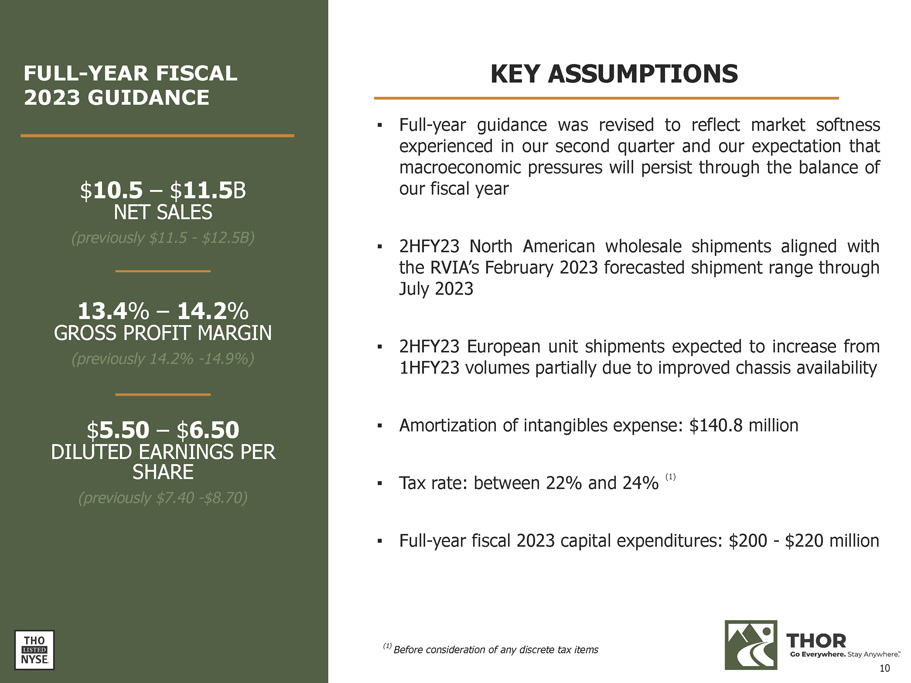 CAPITAL MANAGEMENT PRIORITIES AND FISCAL YEAR 2023 ACTIONS Invest in THOR’s business ▪ Capex spending of $101.0 million YTD Pay THOR's dividend ▪ Increased regular quarterly dividend to $0.45 in October 2022 ▪ Represents 13th consecutive year of dividend Reduce the Company's debt obligations ▪ Reduced debt with principal payments of $12.4 million on our Term Loan and paydown of $15.0 million on the ABL YTD ▪ Subsequent to 1/31/23, we further p aid down $15.0 million on our U.S. Term Loan and $15.0 million on our ABL Repurchase shares on a strategic and opportunistic basis ▪ Repurchased $25.4 million YTD ▪ $507.8 million available to be repurchased as of January 31, 2023 under current authorizations Support opportunistic strategic investments 9