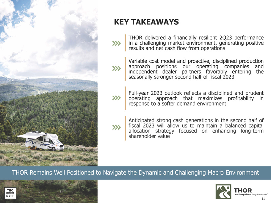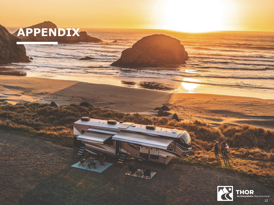 KEY TAKEAWAYS THOR delivered a financially resilient 2 Q 23 performance in a challenging market environment, generating positive results and net cash flow from operations Variable cost model and proactive, disciplined production approach positions our operating companies and independent dealer partners favorably entering the seasonally stronger second half of fiscal 2023 Full - year 2023 outlook reflects a disciplined and prudent operating approach that maximizes profitability in response to a softer demand environment Anticipated strong cash generations in the second half of fiscal 2023 will allow us to maintain a balanced capital allocation strategy focused on enhancing long - term shareholder value THOR Remains Well Positioned to Navigate the Dynamic and Challenging Macro Environment 11