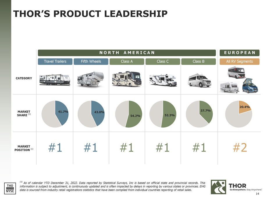 THOR’S PRODUCT LEADERSHIP ( 1 ) As of calendar YTD December 31 , 2022 . Data reported by Statistical Surveys, Inc is based on official state and provincial records . This information is subject to adjustment, is continuously updated and is often impacted by delays in reporting by various states or provinces . EHG data is sourced from industry retail registrations statistics that have been compiled from individual countries reporting of retail sales . CATEGORY N O R T H A M E R I C A N E U R O P E A N All RV Segments Travel Trailers Fifth Wheels Class A Class C Class B MARKET SHARE (1) 41.7% 43.0% 54.2% 52.3% 37.7% 20.4% MARKET POSITION (1) #1 #1 #1 #1 #1 #2 14