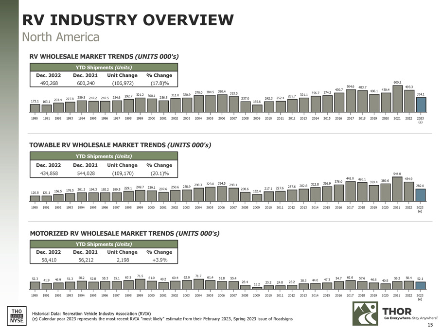 120.8 121.1 156.5 176.5 201.3 194.3 192.2 199.5 229.1 249.7 239.1 207.6 250.6 258.9 298.3 323.0 334.5 298.1 208.6 217.1 227.6 152.4 257.6 282.8 312.8 326.9 442.0 376.0 426.1 359.4 389.6 544.0 434.9 282.0 1990 1991 1992 1993 1994 1995 1996 1997 1998 1999 2000 2001 2002 2003 2004 2005 2006 2007 2008 2009 2010 2011 2012 2013 2014 2015 2016 2017 2018 2019 2020 2021 2022 2023 (e) 173.1 163.1 203.4 227.8 259.5 247.2 247.5 254.6 292.7 321.2 300.1 256.8 311.0 320.9 370.0 384.5 390.4 353.5 237.0 165.6 242.3 252.4 285.7 321.1 356.7 430.7 374.2 504.6 483.7 406.1 430.4 600.2 493.3 334.1 1990 1991 1992 1993 1994 1995 1996 1997 1998 1999 2000 2001 2002 2003 2004 2005 2006 2007 2008 2009 2010 2011 2012 2013 2014 2015 2016 2017 2018 2019 2020 2021 2022 2023 (e) TOWABLE RV WHOLESALE MARKET TRENDS (UNITS 000's) YTD Shipments (Units) Dec. 2022 493,268 Dec. 2021 600,240 Unit Change (106,972) % Change (17.8)% YTD Shipments (Units) Dec. 2022 434,858 Dec. 2021 544,028 Unit Change (109,170) % Change (20.1)% 52.3 41.9 46.9 51.3 58.2 52.8 55.3 55.1 63.5 71.5 61.0 49.2 60.4 62.0 71.7 61.4 55.8 55.4 28.4 13.2 25.2 24.8 28.2 38.3 44.0 47.3 54.7 62.6 57.6 46.6 40.8 56.2 58.4 52.1 1990 1991 1992 1993 1994 1995 1996 1997 1998 1999 2000 2001 2002 2003 2004 2005 2006 2007 2008 2009 2010 2011 2012 2013 2014 2015 2016 2017 2018 2019 2020 2021 2022 2023 (e) YTD Shipments (Units) Dec. 2022 Dec. 2021 Unit Change % Change 58,410 56,212 2,198 +3.9% Historical Data: Recreation Vehicle Industry Association (RVIA) RV INDUSTRY OVERVIEW North America RV WHOLESALE MARKET TRENDS (UNITS 000's) MOTORIZED RV WHOLESALE MARKET TRENDS (UNITS 000's) (e) Calendar year 2023 represents the most recent RVIA "most likely" estimate from their February 2023, Spring 2023 issue of Roadsigns 15