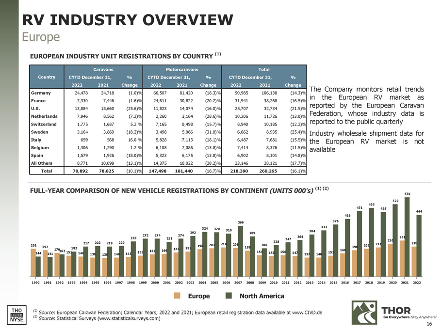 Country Caravans CYTD December 31, 2022 2021 % Change Motorcaravans CYTD December 31, 2022 2021 % Change Total CYTD December 31, 2022 2021 % Change Germany 24,478 24,718 (1.0)% 66,507 81,420 (18.3)% 90,985 106,138 (14.3)% France 7,330 7,446 (1.6)% 24,611 30,822 (20.2)% 31,941 38,268 (16.5)% U.K. 13,884 18,660 (25.6)% 11,823 14,074 (16.0)% 25,707 32,734 (21.5)% Netherlands 7,946 8,562 (7.2)% 2,260 3,164 (28.6)% 10,206 11,726 (13.0)% Switzerland 1,775 1,687 5.2 % 7,165 8,498 (15.7)% 8,940 10,185 (12.2)% Sweden 3,164 3,869 (18.2)% 3,498 5,066 (31.0)% 6,662 8,935 (25.4)% Italy 659 568 16.0 % 5,828 7,113 (18.1)% 6,487 7,681 (15.5)% Belgium 1,306 1,290 1.2 % 6,108 7,086 (13.8)% 7,414 8,376 (11.5)% Spain 1,579 1,926 (18.0)% 5,323 6,175 (13.8)% 6,902 8,101 (14.8)% All Others 8,771 10,099 (13.1)% 14,375 18,022 (20.2)% 23,146 28,121 (17.7)% Total 70,892 78,825 (10.1)% 147,498 181,440 (18.7)% 218,390 260,265 (16.1)% The Company monitors retail trends in the European RV market as reported by the European Caravan Federation, whose industry data is reported to the public quarterly Industry wholesale shipment data for the European RV market is not available 201 192 146 138 135 140 143 152 162 166 174 182 198 203 210 208 189 154 150 156 147 137 140 152 168 190 202 211 236 261 218 144 141 170 162 151 182 217 222 219 220 253 272 274 251 274 292 324 320 310 366 289 206 228 247 264 304 333 376 416 471 465 522 493 570 444 1990 1991 1992 1993 1994 1995 1996 1997 1998 1999 2000 2001 2002 2003 2004 2005 2006 2007 2008 2009 2010 2011 2012 2013 2014 2015 2016 2017 2018 2019 2020 2021 2022 Europe North America (1) Source : European Caravan Federation; Calendar Years, 2022 and 2021; European retail registration data available at www.CIVD.de FULL - YEAR COMPARISON OF NEW VEHICLE REGISTRATIONS BY CONTINENT (UNITS 000's) (1) (2) RV INDUSTRY OVERVIEW Europe EUROPEAN INDUSTRY UNIT REGISTRATIONS BY COUNTRY (1) (2) Source : Statistical Surveys (www.statisticalsurveys.com) 16