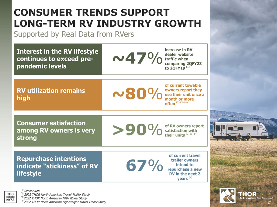 17 Repurchase intentions indicate “stickiness” of RV lifestyle Consumer satisfaction among RV owners is very strong RV utilization remains high Interest in the RV lifestyle continues to exceed pre - pandemic levels ~47 % CONSUMER TRENDS SUPPORT LONG - TERM RV INDUSTRY GROWTH Supported by Real Data from RVers >90 % of current travel 67 % trailer owners intend to repurchase a new RV in the next 2 years (2) (1) SimilarWeb (2) 2022 THOR North American Travel Trailer Study (3) 2022 THOR North American Fifth Wheel Study (4) 2022 THOR North American Lightweight Travel Trailer Study ~80 % of current towable owners report they use their unit once a month or more often (2) (3) (4) increase in RV dealer website traffic when comparing 2QFY23 to 2QFY19 (1) of RV owners report satisfaction with their units (2) (3) (4)