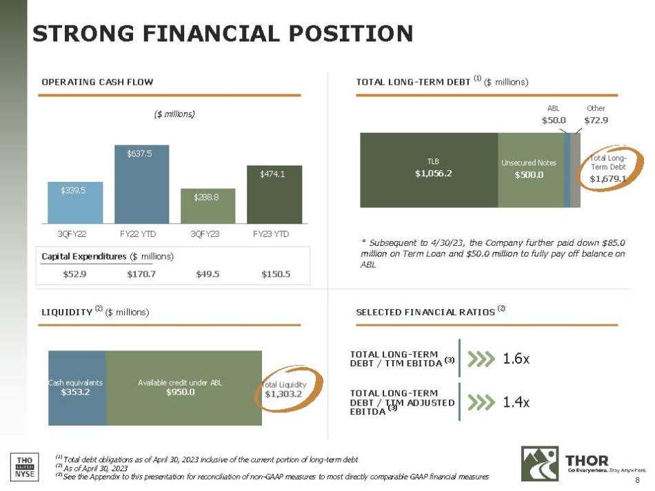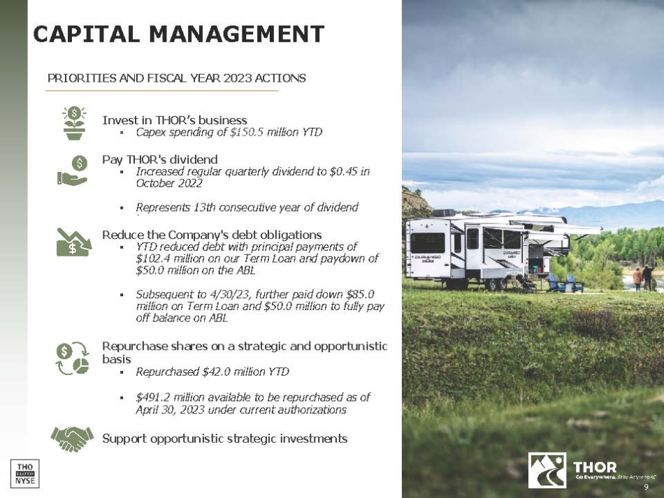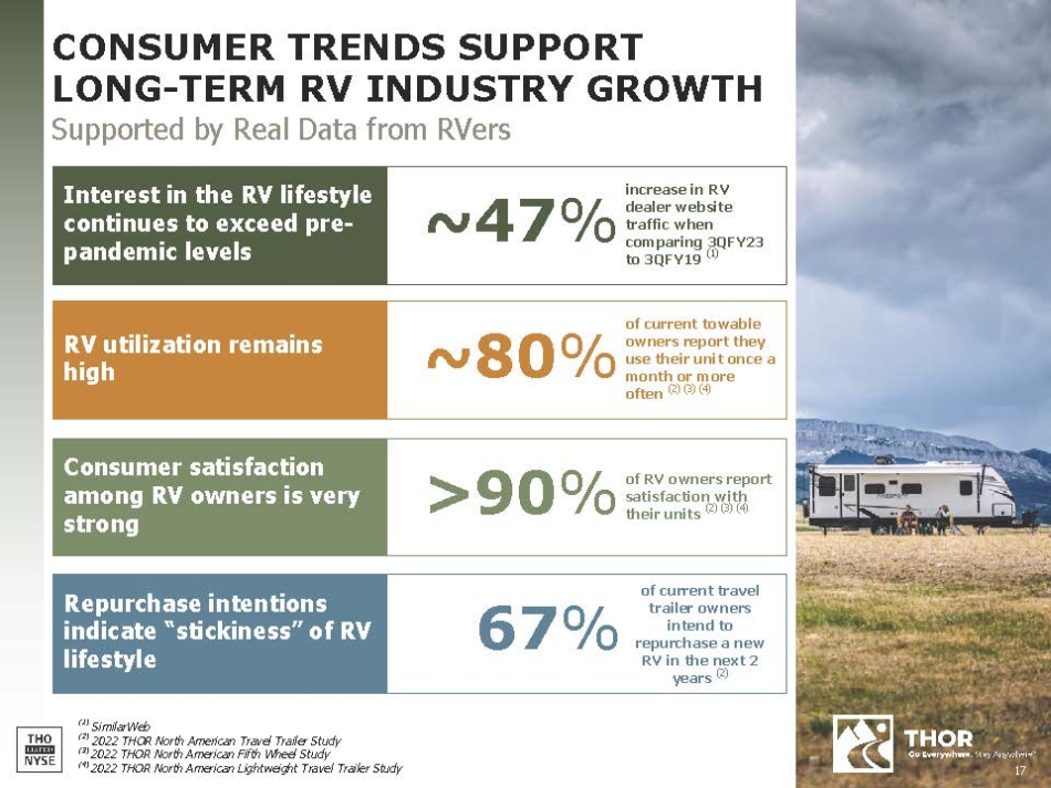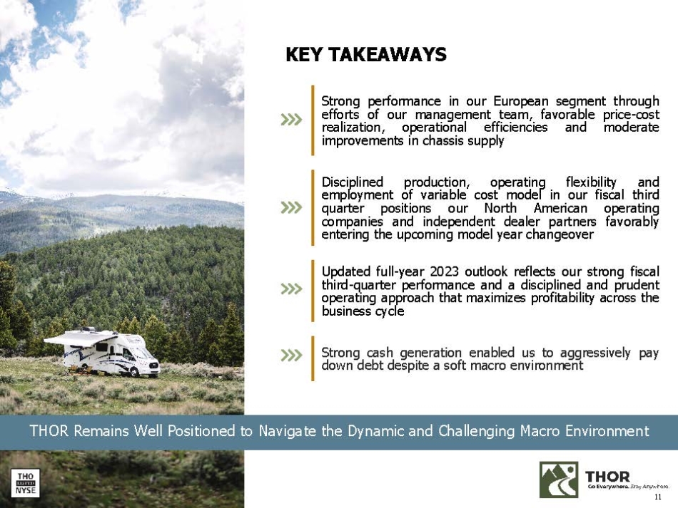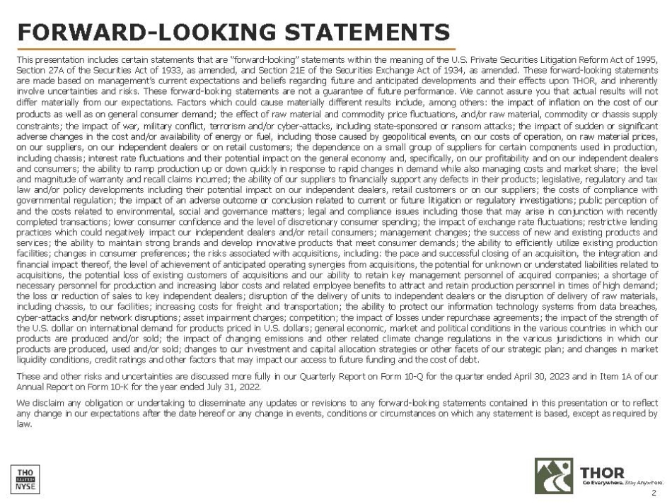 FORWARD - LOOKING STATEMENTS This presentation includes certain statements that are “forward - looking” statements within the meaning of the U . S . Private Securities Litigation Reform Act of 1995 , Section 27 A of the Securities Act of 1933 , as amended, and Section 21 E of the Securities Exchange Act of 1934 , as amended . These forward - looking statements are made based on management’s current expectations and beliefs regarding future and anticipated developments and their effects upon THOR, and inherently involve uncertainties and risks . These forward - looking statements are not a guarantee of future performance . We cannot assure you that actual results will not differ materially from our expectations . Factors which could cause materially different results include, among others : the impact of inflation on the cost of our products as well as on general consumer demand ; the effect of raw material and commodity price fluctuations, and/or raw material, commodity or chassis supply constraints ; the impact of war, military conflict, terrorism and/or cyber - attacks, including state - sponsored or ransom attacks ; the impact of sudden or significant adverse changes in the cost and/or availability of energy or fuel, including those caused by geopolitical events, on our costs of operation, on raw material prices, on our suppliers, on our independent dealers or on retail customers ; the dependence on a small group of suppliers for certain components used in production, including chassis ; interest rate fluctuations and their potential impact on the general economy and, specifically, on our profitability and on our independent dealers and consumers ; the ability to ramp production up or down quickly in response to rapid changes in demand while also managing costs and market share ; the level and magnitude of warranty and recall claims incurred ; the ability of our suppliers to financially support any defects in their products ; legislative, regulatory and tax law and/or policy developments including their potential impact on our independent dealers, retail customers or on our suppliers ; the costs of compliance with governmental regulation ; the impact of an adverse outcome or conclusion related to current or future litigation or regulatory investigations ; public perception of and the costs related to environmental, social and governance matters ; legal and compliance issues including those that may arise in conjunction with recently completed transactions ; lower consumer confidence and the level of discretionary consumer spending ; the impact of exchange rate fluctuations ; restrictive lending practices which could negatively impact our independent dealers and/or retail consumers ; management changes ; the success of new and existing products and services ; the ability to maintain strong brands and develop innovative products that meet consumer demands ; the ability to efficiently utilize existing production facilities ; changes in consumer preferences ; the risks associated with acquisitions, including : the pace and successful closing of an acquisition, the integration and financial impact thereof, the level of achievement of anticipated operating synergies from acquisitions, the potential for unknown or understated liabilities related to acquisitions, the potential loss of existing customers of acquisitions and our ability to retain key management personnel of acquired companies ; a shortage of necessary personnel for production and increasing labor costs and related employee benefits to attract and retain production personnel in times of high demand ; the loss or reduction of sales to key independent dealers ; disruption of the delivery of units to independent dealers or the disruption of delivery of raw materials, including chassis, to our facilities ; increasing costs for freight and transportation ; the ability to protect our information technology systems from data breaches, cyber - attacks and/or network disruptions ; asset impairment charges ; competition ; the impact of losses under repurchase agreements ; the impact of the strength of the U . S . dollar on international demand for products priced in U . S . dollars ; general economic, market and political conditions in the various countries in which our products are produced and/or sold ; the impact of changing emissions and other related climate change regulations in the various jurisdictions in which our products are produced, used and/or sold ; changes to our investment and capital allocation strategies or other facets of our strategic plan ; and changes in market liquidity conditions, credit ratings and other factors that may impact our access to future funding and the cost of debt . These and other risks and uncertainties are discussed more fully in our Quarterly Report on Form 10 - Q for the quarter ended April 30 , 2023 and in Item 1 A of our Annual Report on Form 10 - K for the year ended July 31 , 2022 . We disclaim any obligation or undertaking to disseminate any updates or revisions to any forward - looking statements contained in this presentation or to reflect any change in our expectations after the date hereof or any change in events, conditions or circumstances on which any statement is based, except as required by law . 2