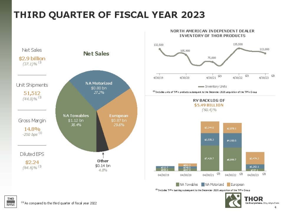 THIRD QUARTER FISCAL 2023 HIGHLIGHTS 3 Disciplined Production, Variable Cost Model and Strong Performance of the European Segment Underpin Solid Third Quarter Results Net sales of $2.9 billion in 3Q23, down from a fiscal third quarter record of $4.7 billion in the prior - year period ▪ Prudently managed North American wholesale production levels given cautious ordering patterns by our independent dealers amid an uncertain market environment ▪ Proactively assisted our North American independent dealers in destocking approximately 8,300 units from channel inventory and reducing a substantial number of prior - model - year units Diluted EPS of $2.24 ▪ THOR achieved gross profit margin of 14.8% despite a 45% reduction in unit shipments versus the prior - year period ▪ Leveraged variable cost model in North America to temporarily rightsize cost structure with current market conditions ▪ Delivered strong performance in our European segment through favorable price - cost realization, operational efficiencies and improved chassis supply Generated $288.8 million of net cash flow from operations in 3Q23 ▪ Company paid down $90.0 million on its U.S. Term Loan B and $35.0 million on the ABL as well as repurchased $16.6 million of its common stock during 3Q23 ▪ S ubsequent to the end of the fiscal third quarter, the Company p aid down an additional $85.0 million on its U.S. Term Loan B and made principal payments totaling $50.0 million to fully pay off the outstanding balance on its ABL