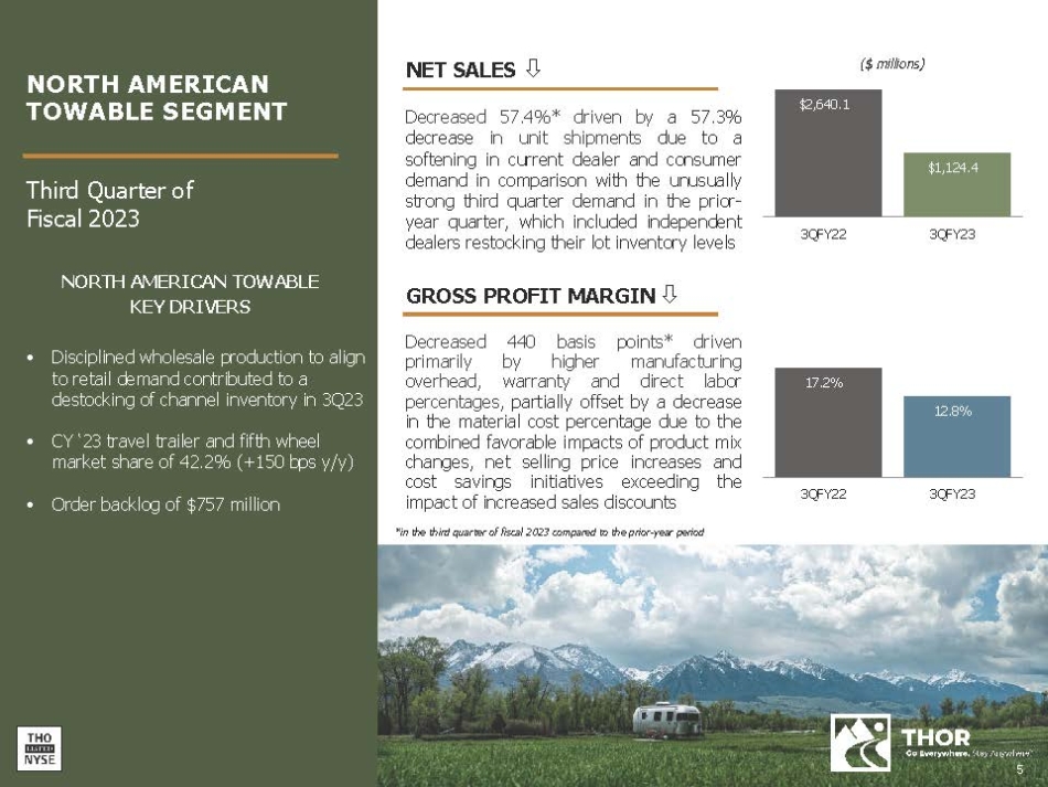 $857.9 $7,429.7 $6,899.7 $757.1 $513.7 $896.0 $548.0 $3,550.3 $4,100.0 $1,263.1 $803.5 $3,344.0 $2,878.1 $3,474.3 NA Towables NA Motorized European (3) Includes Tiffin backlog subsequent to the December 2020 acquisition of the Tiffin Group 04/30/19 04/30/20 04/30/21 04/30/22 04/30/23 European $0.87 bn 29.6% NA Motorized $0.80 bn 27.2% NA Towables $1.12 bn 38.4% Other $0.14 bn 4.8% 132,500 105,900 75,000 135,500 113,000 NORTH AMERICAN INDEPENDENT DEALER INVENTORY OF THOR PRODUCTS RV BACKLOG OF $5.49 BILLION (60.4)% Inventory Units (2) Includes units of Tiffin products subsequent to the December 2020 acquisition of the Tiffin Group (2) 4/30/23 (1) As compared to the third quarter of fiscal year 2022 THIRD QUARTER OF FISCAL YEAR 2023 Gross Margin 14.8% - 250 bps (1) Diluted EPS $2.24 (64.6)% (1) Net Sales $2.9 billion (37.1)% (1) (2) (3) (3) 4/30/19 4/30/20 4/30/21 (2) 4/30/22 Unit Shipments 51,512 (44.9)% (1) 4 (3) Net Sales