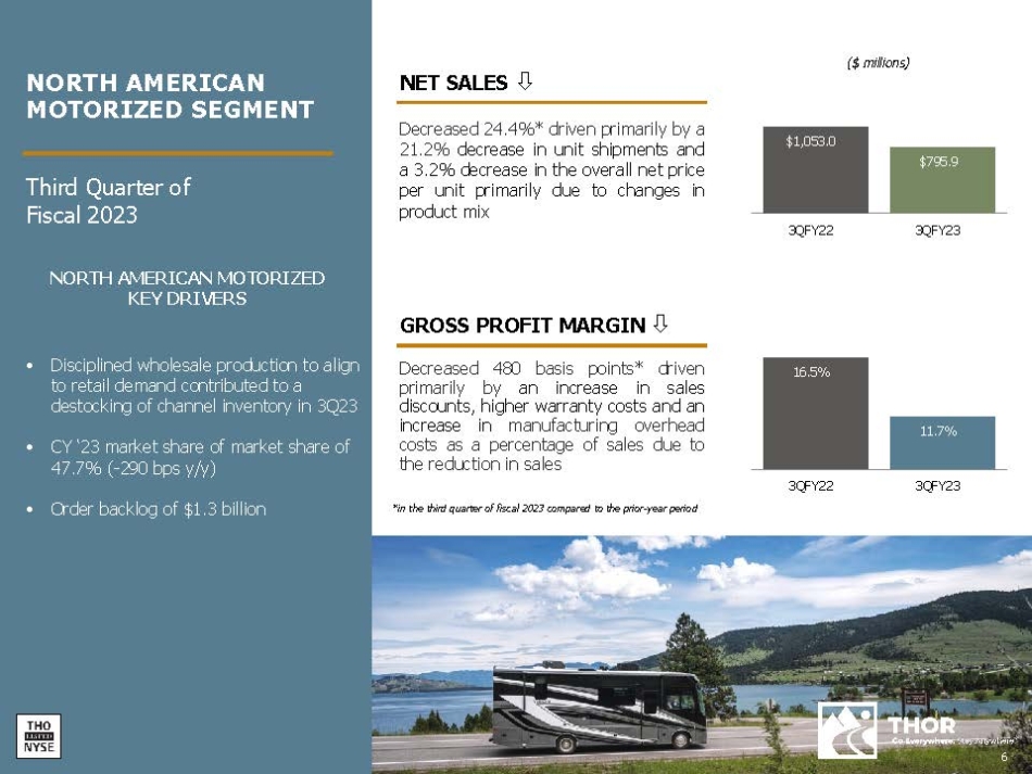 ($ millions) $2,640.1 $1,124.4 3QFY22 3QFY23 17.2% 12.8% 3QFY22 3QFY23 NET SALES  Decreased 57 . 4 % * driven by a 57 . 3 % decrease in unit shipments due to a softening in current dealer and consumer demand in comparison with the unusually strong third quarter demand in the prior - year quarter, which included independent dealers restocking their lot inventory levels GROSS PROFIT MARGIN  Decreased 440 basis points* driven primarily by higher manufacturing overhead, warranty and direct labor percentages, partially offset by a decrease in the material cost percentage due to the combined favorable impacts of product mix changes, net selling price increases and cost savings initiatives exceeding the impact of increased sales discounts *in the third quarter of fiscal 2023 compared to the prior - year period NORTH AMERICAN TOWABLE SEGMENT Third Quarter of Fiscal 2023 NORTH AMERICAN TOWABLE KEY DRIVERS • Disciplined wholesale production to align to retail demand contributed to a destocking of channel inventory in 3Q23 • CY ‘23 travel trailer and fifth wheel market share of 42.2% (+150 bps y/y) • Order backlog of $757 million 5