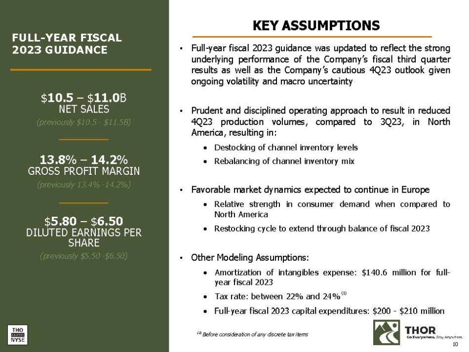 CAPITAL MANAGEMENT PRIORITIES AND FISCAL YEAR 2023 ACTIONS Invest in THOR’s business ▪ Capex spending of $150.5 million YTD Pay THOR's dividend ▪ Increased regular quarterly dividend to $0.45 in October 2022 ▪ Represents 13th consecutive year of dividend Reduce the Company's debt obligations ▪ YTD reduced debt with principal payments of $102.4 million on our Term Loan and paydown of $50.0 million on the ABL ▪ Subsequent to 4/30/23, further p aid down $85.0 million on Term Loan and $50.0 million to fully pay off balance on ABL Repurchase shares on a strategic and opportunistic basis ▪ Repurchased $42.0 million YTD ▪ $491.2 million available to be repurchased as of April 30, 2023 under current authorizations Support opportunistic strategic investments 9
