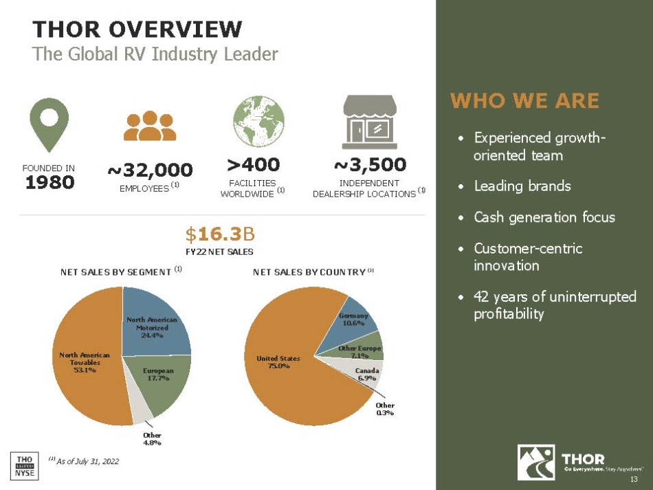THOR OVERVIEW The Global RV Industry Leader WHO WE ARE • Experienced growth - oriented team • Leading brands • Cash generation focus • Customer - centric innovation • 42 years of uninterrupted profitability FOUNDED IN 1980 ~32,000 EMPLOYEES (1) >400 WORLDWIDE FACILITIES (1) ~3,500 INDEPENDENT DEALERSHIP LOCATIONS (1) NET SALES BY SEGMENT (1) NET SALES BY COUNTRY (1) $ 16.3 B FY22 NET SALES Other 4.8% (1) As of July 31, 2022 United States 75.0% Germany 10.6% Other Europe 7.1% Canada 6.9% Other 0.3% North American Towables 53.1% North American Motorized 24.4% European 17.7% 13
