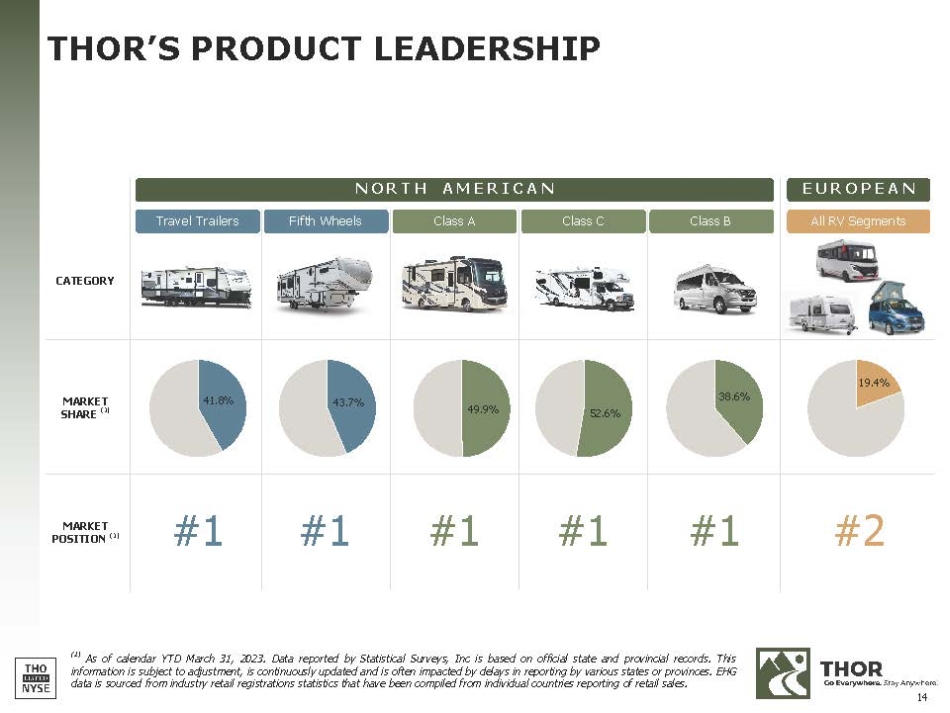 THOR’S PRODUCT LEADERSHIP ( 1 ) As of calendar YTD March 31 , 2023 . Data reported by Statistical Surveys, Inc is based on official state and provincial records . This information is subject to adjustment, is continuously updated and is often impacted by delays in reporting by various states or provinces . EHG data is sourced from industry retail registrations statistics that have been compiled from individual countries reporting of retail sales . E U R O P E A N All RV Segments N O R T H A M E R I C A N CATEGORY Class B Class C Class A Fifth Wheels Travel Trailers 19.4% 38.6% 52.6% 49.9% 43.7% 41.8% MARKET SHARE (1) #2 #1 #1 #1 #1 #1 MARKET POSITION (1) 14