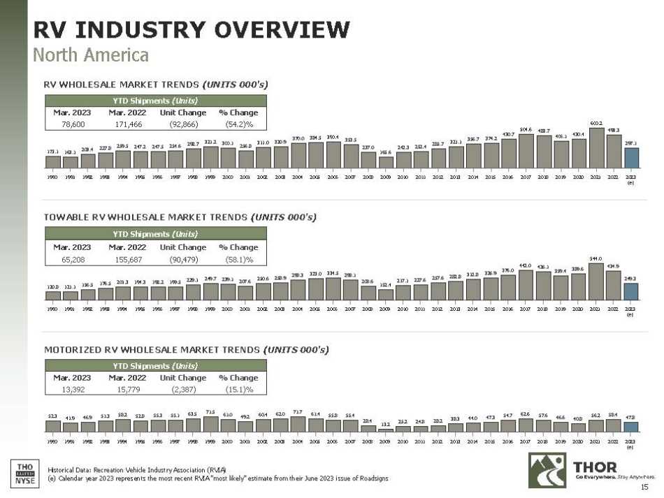 120.8 121.1 156.5 176.5 201.3 194.3 192.2 199.5 229.1 249.7 239.1 207.6 250.6 258.9 298.3 323.0 334.5 298.1 208.6 217.1 227.6 152.4 257.6 282.8 312.8 326.9 442.0 376.0 426.1 359.4 389.6 544.0 434.9 249.3 2023 2022 2021 2020 2019 2018 2017 2016 2015 2014 2013 2012 2011 2010 2009 2008 2007 2006 2003 2004 2005 2001 2002 1996 1997 1998 1999 2000 1993 1994 1995 1990 1991 1992 (e) 173.1 163.1 203.4 227.8 259.5 247.2 247.5 254.6 292.7 321.2 300.1 256.8 311.0 320.9 370.0 384.5 390.4 353.5 237.0 165.6 242.3 252.4 285.7 321.1 356.7 430.7 374.2 504.6 483.7 406.1 430.4 600.2 493.3 297.1 2023 2022 2021 2020 2019 2018 2017 2016 2015 2014 2013 2012 2011 2010 2009 2008 2007 2006 2005 2004 2003 2000 2001 2002 1996 1997 1998 1999 1993 1994 1995 1990 1991 1992 (e) TOWABLE RV WHOLESALE MARKET TRENDS (UNITS 000's) YTD Shipments (Units) Mar. 2023 78,600 Mar. 2022 171,466 Unit Change (92,866) % Change (54.2)% YTD Shipments (Units) Mar. 2023 65,208 Mar. 2022 155,687 Unit Change (90,479) % Change (58.1)% 52.3 41.9 46.9 51.3 58.2 52.8 55.3 55.1 63.5 71.5 61.0 49.2 60.4 62.0 71.7 61.4 55.8 55.4 28.4 13.2 25.2 24.8 28.2 38.3 44.0 47.3 54.7 62.6 57.6 46.6 40.8 56.2 58.4 47.8 1990 1991 1992 1993 1994 1995 1996 1997 1998 1999 2000 2001 2002 2003 2004 2005 2006 2007 2008 2009 2010 2011 2012 2013 2014 2015 2016 2017 2018 2019 2020 2021 2022 2023 (e) YTD Shipments (Units) % Change Unit Change Mar. 2022 Mar. 2023 (15.1)% (2,387) 15,779 13,392 Historical Data: Recreation Vehicle Industry Association (RVIA) RV INDUSTRY OVERVIEW North America RV WHOLESALE MARKET TRENDS (UNITS 000's) MOTORIZED RV WHOLESALE MARKET TRENDS (UNITS 000's) (e) Calendar year 2023 represents the most recent RVIA "most likely" estimate from their June 2023 issue of Roadsigns 15