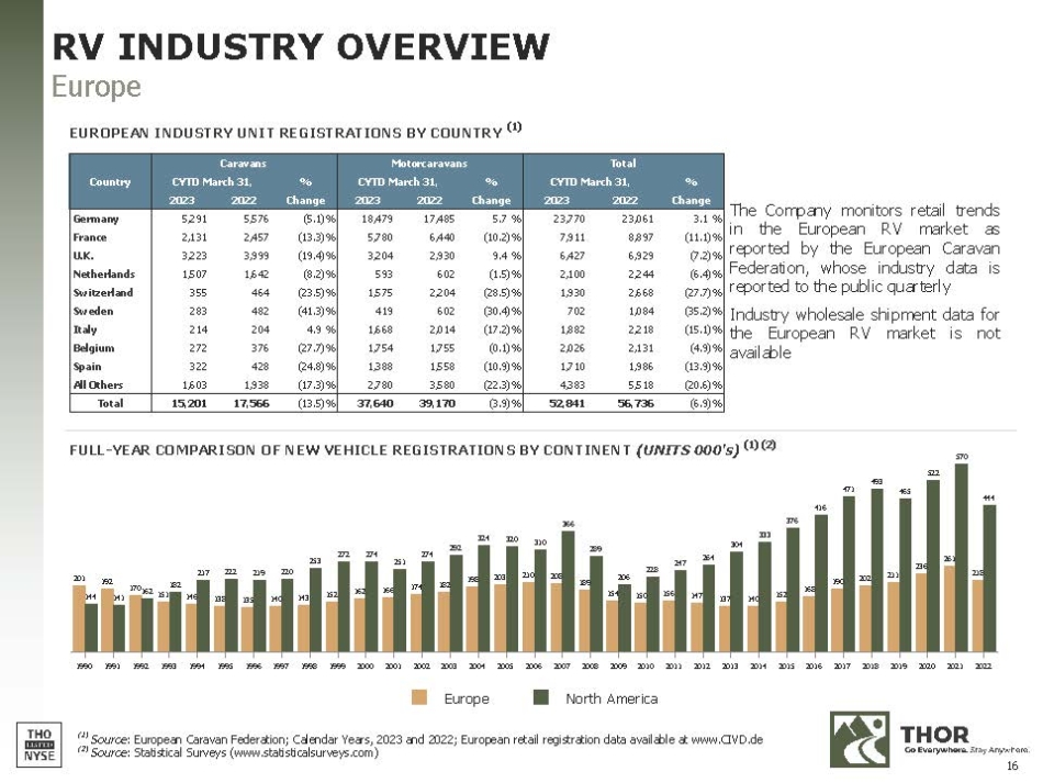 % Change Total CYTD March 31, 2023 2022 % Change Motorcaravans CYTD March 31, 2023 2022 % Change Caravans CYTD March 31, 2023 2022 Country 3.1 % 23,061 23,770 5.7 % 17,485 18,479 (5.1)% 5,576 5,291 Germany (11.1)% 8,897 7,911 (10.2)% 6,440 5,780 (13.3)% 2,457 2,131 France (7.2)% 6,929 6,427 9.4 % 2,930 3,204 (19.4)% 3,999 3,223 U.K. (6.4)% 2,244 2,100 (1.5)% 602 593 (8.2)% 1,642 1,507 Netherlands (27.7)% 2,668 1,930 (28.5)% 2,204 1,575 (23.5)% 464 355 Switzerland (35.2)% 1,084 702 (30.4)% 602 419 (41.3)% 482 283 Sweden (15.1)% 2,218 1,882 (17.2)% 2,014 1,668 4.9 % 204 214 Italy (4.9)% 2,131 2,026 (0.1)% 1,755 1,754 (27.7)% 376 272 Belgium (13.9)% 1,986 1,710 (10.9)% 1,558 1,388 (24.8)% 428 322 Spain (20.6)% 5,518 4,383 (22.3)% 3,580 2,780 (17.3)% 1,938 1,603 All Others (6.9)% 56,736 52,841 (3.9)% 39,170 37,640 (13.5)% 17,566 15,201 Total The Company monitors retail trends in the European RV market as reported by the European Caravan Federation, whose industry data is reported to the public quarterly Industry wholesale shipment data for the European RV market is not available 201 192 146 138 135 140 143 152 162 166 174 182 198 203 210 208 189 154 150 156 147 137 140 152 168 190 202 211 236 261 218 144 141 170 162 151 182 217 222 219 220 253 272 274 251 274 292 324 320 310 366 289 206 228 247 264 304 333 376 416 471 493 465 522 570 444 1990 1991 1992 1993 1994 1995 1996 1997 1998 1999 2000 2001 2002 2003 2004 2005 2006 2007 2008 2009 2010 2011 2012 2013 2014 2015 2016 2017 2018 2019 2020 2021 2022 Europe North America (1) Source : European Caravan Federation; Calendar Years, 2023 and 2022; European retail registration data available at www.CIVD.de FULL - YEAR COMPARISON OF NEW VEHICLE REGISTRATIONS BY CONTINENT (UNITS 000's) (1) (2) RV INDUSTRY OVERVIEW Europe EUROPEAN INDUSTRY UNIT REGISTRATIONS BY COUNTRY (1) (2) Source : Statistical Surveys (www.statisticalsurveys.com) 16