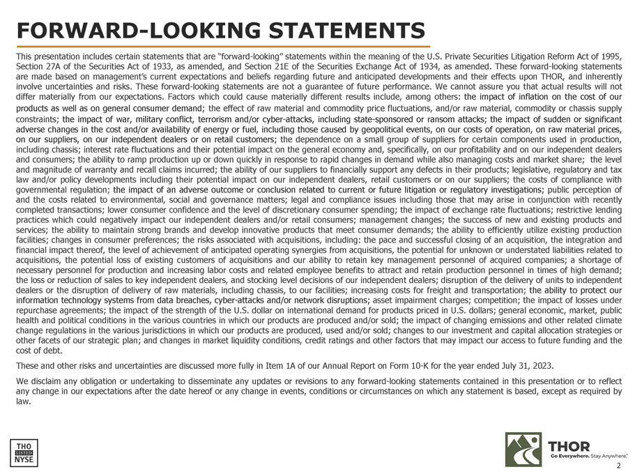 FORWARD - LOOKING STATEMENTS This presentation includes certain statements that are “forward - looking” statements within the meaning of the U . S . Private Securities Litigation Reform Act of 1995 , Section 27 A of the Securities Act of 1933 , as amended, and Section 21 E of the Securities Exchange Act of 1934 , as amended . These forward - looking statements are made based on management’s current expectations and beliefs regarding future and anticipated developments and their effects upon THOR, and inherently involve uncertainties and risks . These forward - looking statements are not a guarantee of future performance . We cannot assure you that actual results will not differ materially from our expectations . Factors which could cause materially different results include, among others : the impact of inflation on the cost of our products as well as on general consumer demand ; the effect of raw material and commodity price fluctuations, and/or raw material, commodity or chassis supply constraints ; the impact of war, military conflict, terrorism and/or cyber - attacks, including state - sponsored or ransom attacks ; the impact of sudden or significant adverse changes in the cost and/or availability of energy or fuel, including those caused by geopolitical events, on our costs of operation, on raw material prices, on our suppliers, on our independent dealers or on retail customers ; the dependence on a small group of suppliers for certain components used in production, including chassis ; interest rate fluctuations and their potential impact on the general economy and, specifically, on our profitability and on our independent dealers and consumers ; the ability to ramp production up or down quickly in response to rapid changes in demand while also managing costs and market share ; the level and magnitude of warranty and recall claims incurred ; the ability of our suppliers to financially support any defects in their products ; legislative, regulatory and tax law and/or policy developments including their potential impact on our independent dealers, retail customers or on our suppliers ; the costs of compliance with governmental regulation ; the impact of an adverse outcome or conclusion related to current or future litigation or regulatory investigations ; public perception of and the costs related to environmental, social and governance matters ; legal and compliance issues including those that may arise in conjunction with recently completed transactions ; lower consumer confidence and the level of discretionary consumer spending ; the impact of exchange rate fluctuations ; restrictive lending practices which could negatively impact our independent dealers and/or retail consumers ; management changes ; the success of new and existing products and services ; the ability to maintain strong brands and develop innovative products that meet consumer demands ; the ability to efficiently utilize existing production facilities ; changes in consumer preferences ; the risks associated with acquisitions, including : the pace and successful closing of an acquisition, the integration and financial impact thereof, the level of achievement of anticipated operating synergies from acquisitions, the potential for unknown or understated liabilities related to acquisitions, the potential loss of existing customers of acquisitions and our ability to retain key management personnel of acquired companies ; a shortage of necessary personnel for production and increasing labor costs and related employee benefits to attract and retain production personnel in times of high demand ; the loss or reduction of sales to key independent dealers, and stocking level decisions of our independent dealers ; disruption of the delivery of units to independent dealers or the disruption of delivery of raw materials, including chassis, to our facilities ; increasing costs for freight and transportation ; the ability to protect our information technology systems from data breaches, cyber - attacks and/or network disruptions ; asset impairment charges ; competition ; the impact of losses under repurchase agreements ; the impact of the strength of the U . S . dollar on international demand for products priced in U . S . dollars ; general economic, market, public health and political conditions in the various countries in which our products are produced and/or sold ; the impact of changing emissions and other related climate change regulations in the various jurisdictions in which our products are produced, used and/or sold ; changes to our investment and capital allocation strategies or other facets of our strategic plan ; and changes in market liquidity conditions, credit ratings and other factors that may impact our access to future funding and the cost of debt . These and other risks and uncertainties are discussed more fully in Item 1 A of our Annual Report on Form 10 - K for the year ended July 31 , 2023 . We disclaim any obligation or undertaking to disseminate any updates or revisions to any forward - looking statements contained in this presentation or to reflect any change in our expectations after the date hereof or any change in events, conditions or circumstances on which any statement is based, except as required by law . 2
