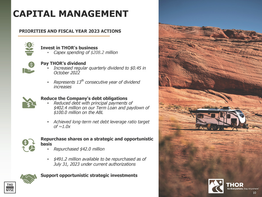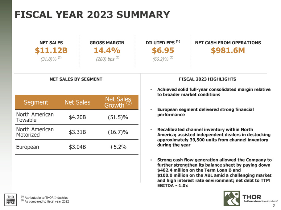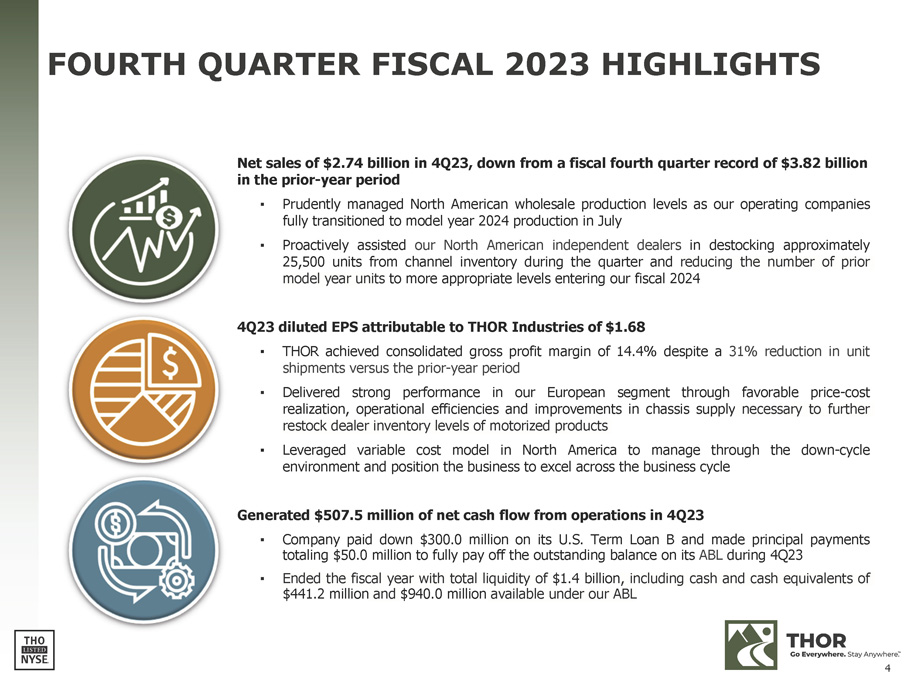 FOURTH QUARTER FISCAL 2023 HIGHLIGHTS Net sales of $2.74 billion in 4Q23, down from a fiscal fourth quarter record of $3.82 billion in the prior - year period ▪ Prudently managed North American wholesale production levels as our operating companies fully transitioned to model year 2024 production in July ▪ Proactively assisted our North American independent dealers in destocking approximately 25,500 units from channel inventory during the quarter and reducing the number of prior model year units to more appropriate levels entering our fiscal 2024 4Q23 diluted EPS attributable to THOR Industries of $1.68 ▪ THOR achieved consolidated gross profit margin of 14.4% despite a 31% reduction in unit shipments versus the prior - year period ▪ Delivered strong performance in our European segment through favorable price - cost realization, operational efficiencies and improvements in chassis supply necessary to further restock dealer inventory levels of motorized products ▪ Leveraged variable cost model in North America to manage through the down - cycle environment and position the business to excel across the business cycle Generated $507.5 million of net cash flow from operations in 4Q23 ŀ Ended the fiscal year with total liquidity of ▪ Company paid down $300.0 million on its U.S. Term Loan B and made principal payments totaling $50.0 million to fully pay off the outstanding balance on its ABL during 4Q23 $1.4 billion , including cash and cash equivalents of $441.2 million and $940.0 million available under our ABL 4