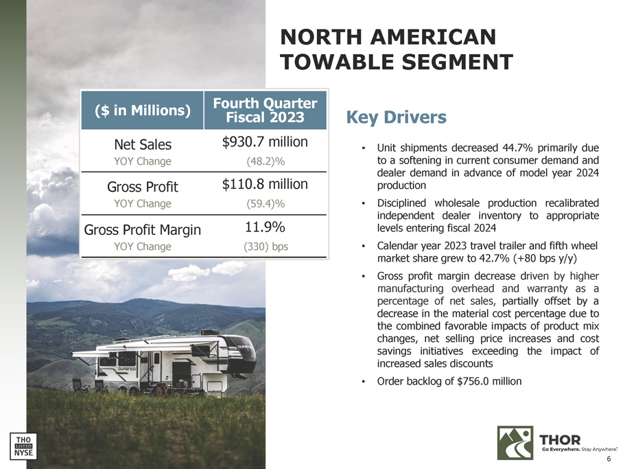 $1,152.0 $5,741.3 $8,761.2 $5,548.6 $693.2 $2,763.7 $9,284.2 $2,571.0 $756.0 $458.8 $1,451.6 $4,014.7 $3,436.6 $1,242.9 $1,526.0 $3,559.1 $2,753.6 $3,549.7 NA Towables NA Motorized European (4) Includes Tiffin backlog subsequent to the December 2020 acquisition of the Tiffin Group 07/31/19 07/31/20 07/31/21 07/31/22 07/31/23 European $1.02 bn 37.2% NA Motorized $0.66 bn 24.0% NA Towable $0.93 bn 34.0% Other $0.13 bn 4.8% 103,400 63,900 58,300 87,500 7/31/19 7/31/20 7/31/23 NORTH AMERICAN INDEPENDENT DEALER INVENTORY OF THOR PRODUCTS 127,000 RV BACKLOG OF $5.55 BILLION (36.7)% $16,858.1 Inventory Units (3) Includes units of Tiffin products subsequent to the December 2020 acquisition of the Tiffin Group (1) As compared to the fourth quarter of fiscal year 2022 (2) Attributable to THOR Industries FOURTH QUARTER OF FISCAL YEAR 2023 Gross Margin 14.4% (310) bps (1) (2) Diluted EPS $1.68 (67.4)% (1) Net Sales $2.74 billion (28.4)% (1) (3) (3) (4) (4) (3) 7/31/21 7/31/22 Unit Shipments 47,152 (31.2)% (1) 5 (4) Net Sales