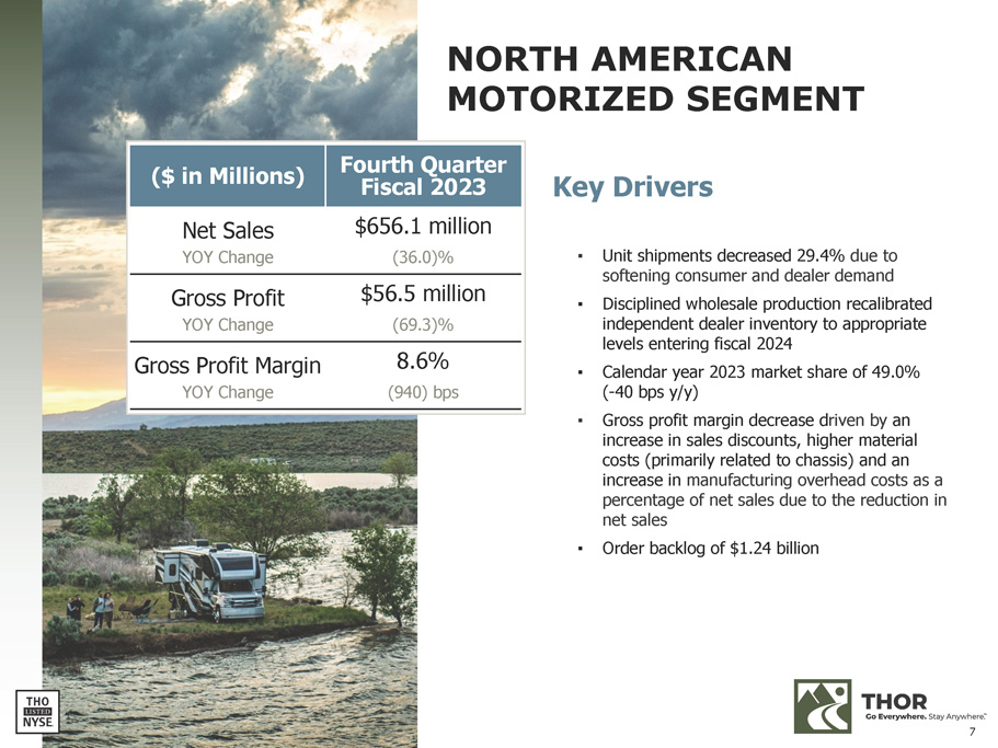 ($ in Millions) Fourth Quarter Fiscal 2023 Net Sales YOY Change Gross Profit YOY Change Gross Profit Margin YOY Change $930.7 million (48.2)% $110.8 million (59.4)% 11.9% (330) bps NORTH AMERICAN TOWABLE SEGMENT 6 Key Drivers ▪ Unit shipments decreased 44 . 7 % primarily due to a softening in current consumer demand and dealer demand in advance of model year 2024 production ▪ Disciplined wholesale production recalibrated independent dealer inventory to appropriate levels entering fiscal 2024 ▪ Calendar year 2023 travel trailer and fifth wheel market share grew to 42 . 7 % (+ 80 bps y/y) ▪ Gross profit margin decrease d riven by higher manufacturing overhead and warranty as a percentage of net sales, partially offset by a decrease in the material cost percentage due to the combined favorable impacts of product mix changes, net selling price increases and cost savings initiatives exceeding the impact of increased sales discounts ▪ Order backlog of $ 756 . 0 million