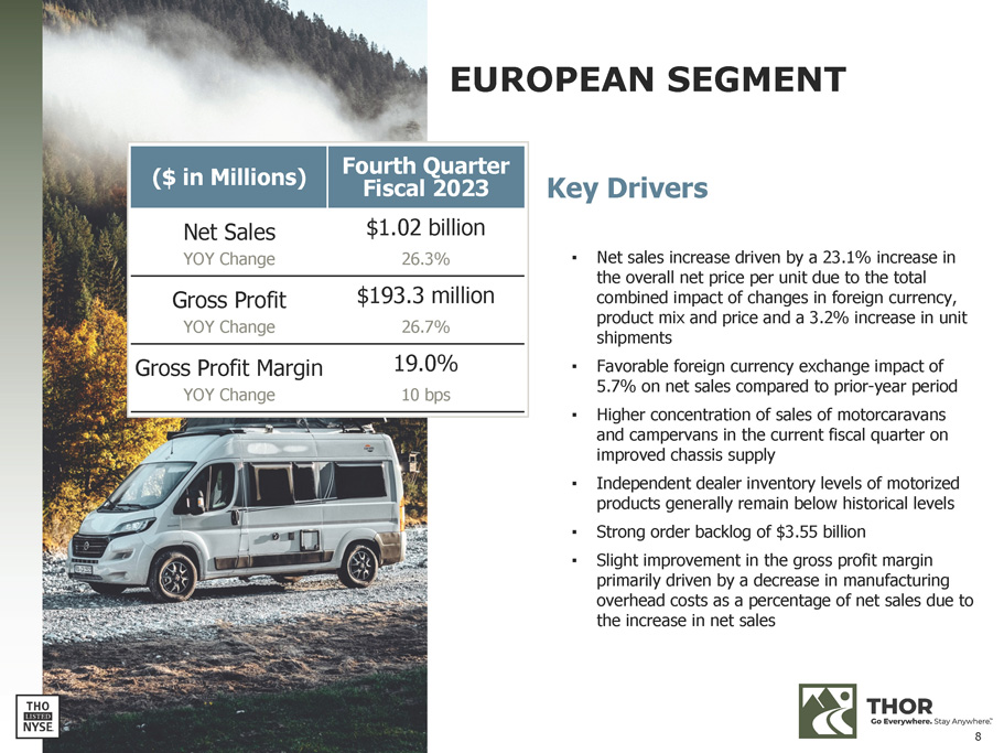 EUROPEAN SEGMENT Key Drivers ▪ Net sales increase driven by a 23.1% increase in the overall net price per unit due to the total combined impact of changes in foreign currency, product mix and price and a 3.2% increase in unit shipments ▪ Favorable foreign currency exchange impact of 5.7% on net sales compared to prior - year period ▪ Higher concentration of sales of motorcaravans and campervans in the current fiscal quarter on improved chassis supply ▪ Independent dealer inventory levels of motorized products generally remain below historical levels ▪ Strong order backlog of $ 3 . 55 billion ▪ Slight improvement in the gross profit margin primarily driven by a decrease in manufacturing overhead costs as a percentage of net sales due to the increase in net sales ($ in Millions) Fourth Quarter Fiscal 2023 Net Sales YOY Change Gross Profit YOY Change Gross Profit Margin YOY Change $1.02 billion 26.3% $193.3 million 26.7% 19.0% 10 bps 8