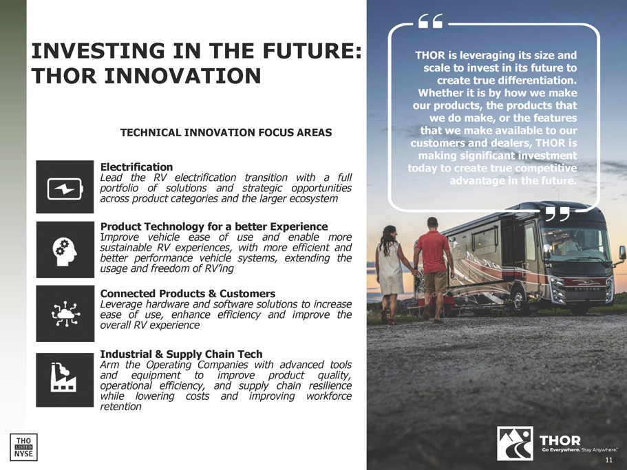 CAPITAL MANAGEMENT PRIORITIES AND FISCAL YEAR 2023 ACTIONS Invest in THOR’s business ▪ Capex spending of $208.2 million Pay THOR's dividend ▪ Increased regular quarterly dividend to $0.45 in October 2022 ▪ Represents 13 th consecutive year of dividend increases Reduce the Company's debt obligations ▪ Reduced debt with principal payments of $402.4 million on our Term Loan and paydown of $100.0 million on the ABL ▪ Achieved long - term net debt leverage ratio target of ~1.0x Repurchase shares on a strategic and opportunistic basis ▪ Repurchased $42.0 million ▪ $491.2 million available to be repurchased as of July 31, 2023 under current authorizations Support opportunistic strategic investments 10