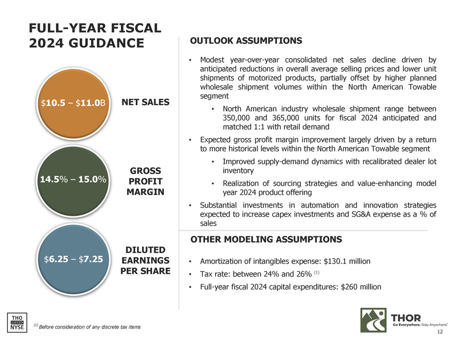 INVESTING IN THE FUTURE: THOR INNOVATION TECHNICAL INNOVATION FOCUS AREAS Electrification Lead the RV electrification transition with a full portfolio of solutions and strategic opportunities across product categories and the larger ecosystem Product Technology for a better Experience I mprove vehicle ease of use and enable more sustainable RV experiences, with more efficient and better performance vehicle systems, extending the usage and freedom of RV’ing Connected Products & Customers Leverage hardware and software solutions to increase ease of use, enhance efficiency and improve the overall RV experience Industrial & Supply Chain Tech Arm the Operating Companies with advanced tools and equipment to improve product quality, operational efficiency, and supply chain resilience while lowering costs and improving workforce retention THOR is leveraging its size and scale to invest in its future to create true differentiation. Whether it is by how we make our products, the products that we do make, or the features that we make available to our customers and dealers, THOR is making significant investment today to create true competitive advantage in the future. 11