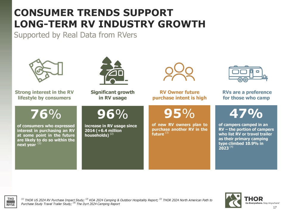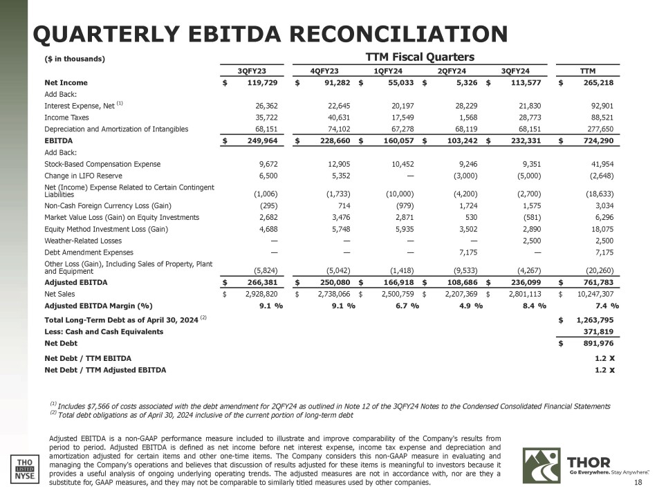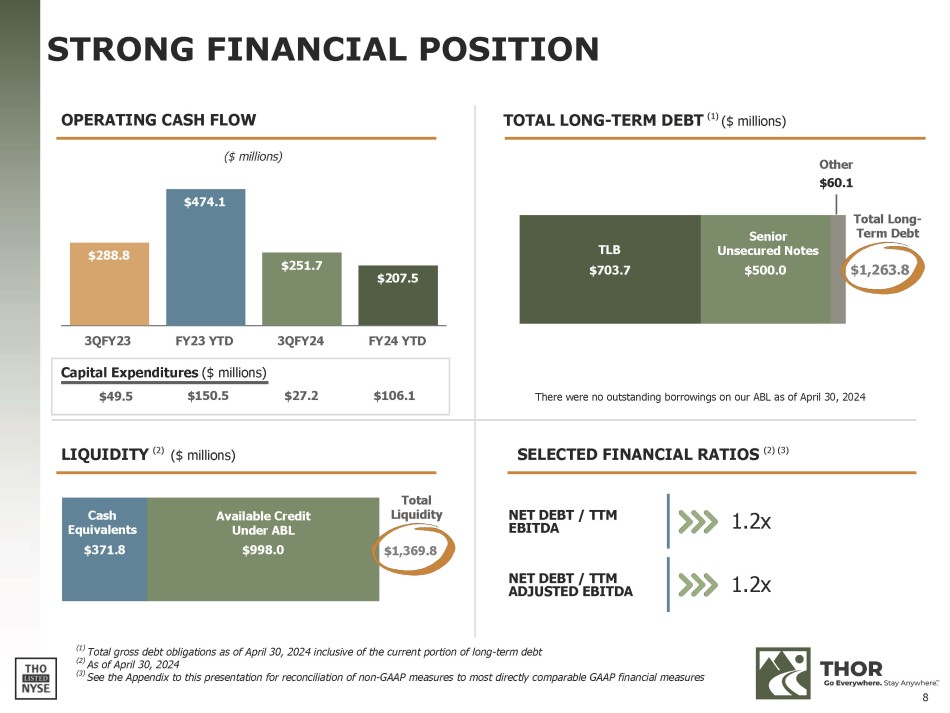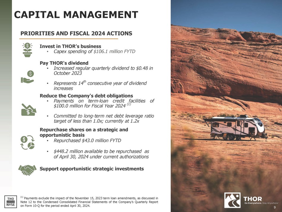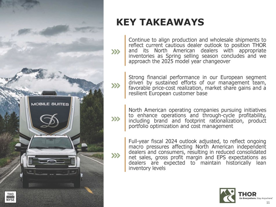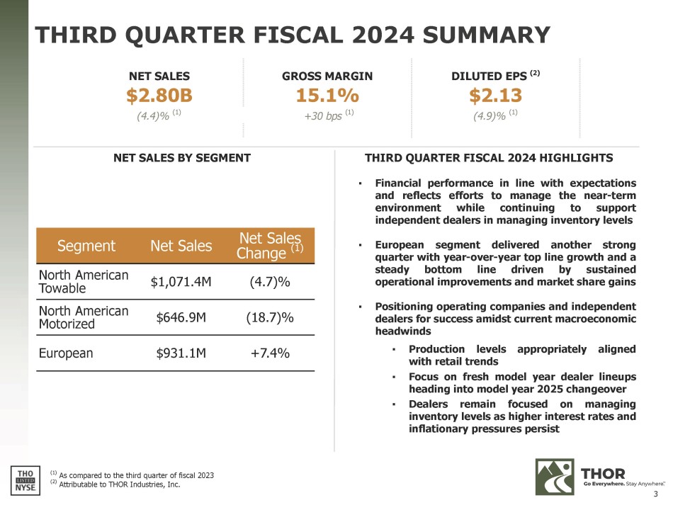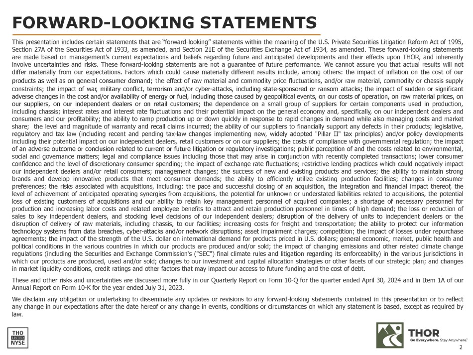 FORWARD - LOOKING STATEMENTS This presentation includes certain statements that are “forward - looking” statements within the meaning of the U . S . Private Securities Litigation Reform Act of 1995 , Section 27 A of the Securities Act of 1933 , as amended, and Section 21 E of the Securities Exchange Act of 1934 , as amended . These forward - looking statements are made based on management’s current expectations and beliefs regarding future and anticipated developments and their effects upon THOR, and inherently involve uncertainties and risks . These forward - looking statements are not a guarantee of future performance . We cannot assure you that actual results will not differ materially from our expectations . Factors which could cause materially different results include, among others : the impact of inflation on the cost of our products as well as on general consumer demand ; the effect of raw material and commodity price fluctuations, and/or raw material, commodity or chassis supply constraints ; the impact of war, military conflict, terrorism and/or cyber - attacks, including state - sponsored or ransom attacks ; the impact of sudden or significant adverse changes in the cost and/or availability of energy or fuel, including those caused by geopolitical events, on our costs of operation, on raw material prices, on our suppliers, on our independent dealers or on retail customers ; the dependence on a small group of suppliers for certain components used in production, including chassis ; interest rates and interest rate fluctuations and their potential impact on the general economy and, specifically, on our independent dealers and consumers and our profitability ; the ability to ramp production up or down quickly in response to rapid changes in demand while also managing costs and market share ; the level and magnitude of warranty and recall claims incurred ; the ability of our suppliers to financially support any defects in their products ; legislative, regulatory and tax law (including recent and pending tax - law changes implementing new, widely adopted "Pillar II" tax principles) and/or policy developments including their potential impact on our independent dealers, retail customers or on our suppliers ; the costs of compliance with governmental regulation ; the impact of an adverse outcome or conclusion related to current or future litigation or regulatory investigations ; public perception of and the costs related to environmental, social and governance matters ; legal and compliance issues including those that may arise in conjunction with recently completed transactions ; lower consumer confidence and the level of discretionary consumer spending ; the impact of exchange rate fluctuations ; restrictive lending practices which could negatively impact our independent dealers and/or retail consumers ; management changes ; the success of new and existing products and services ; the ability to maintain strong brands and develop innovative products that meet consumer demands ; the ability to efficiently utilize existing production facilities ; changes in consumer preferences ; the risks associated with acquisitions, including : the pace and successful closing of an acquisition, the integration and financial impact thereof, the level of achievement of anticipated operating synergies from acquisitions, the potential for unknown or understated liabilities related to acquisitions, the potential loss of existing customers of acquisitions and our ability to retain key management personnel of acquired companies ; a shortage of necessary personnel for production and increasing labor costs and related employee benefits to attract and retain production personnel in times of high demand ; the loss or reduction of sales to key independent dealers, and stocking level decisions of our independent dealers ; disruption of the delivery of units to independent dealers or the disruption of delivery of raw materials, including chassis, to our facilities ; increasing costs for freight and transportation ; the ability to protect our information technology systems from data breaches, cyber - attacks and/or network disruptions ; asset impairment charges ; competition ; the impact of losses under repurchase agreements ; the impact of the strength of the U . S . dollar on international demand for products priced in U . S . dollars ; general economic, market, public health and political conditions in the various countries in which our products are produced and/or sold ; the impact of changing emissions and other related climate change regulations (including the Securities and Exchange Commission's ("SEC") final climate rules and litigation regarding its enforceabilty) in the various jurisdictions in which our products are produced, used and/or sold ; changes to our investment and capital allocation strategies or other facets of our strategic plan ; and changes in market liquidity conditions, credit ratings and other factors that may impact our access to future funding and the cost of debt . These and other risks and uncertainties are discussed more fully in our Quarterly Report on Form 10 - Q for the quarter ended April 30 , 2024 and in Item 1 A of our Annual Report on Form 10 - K for the year ended July 31 , 2023 . We disclaim any obligation or undertaking to disseminate any updates or revisions to any forward - looking statements contained in this presentation or to reflect any change in our expectations after the date hereof or any change in events, conditions or circumstances on which any statement is based, except as required by law . 2