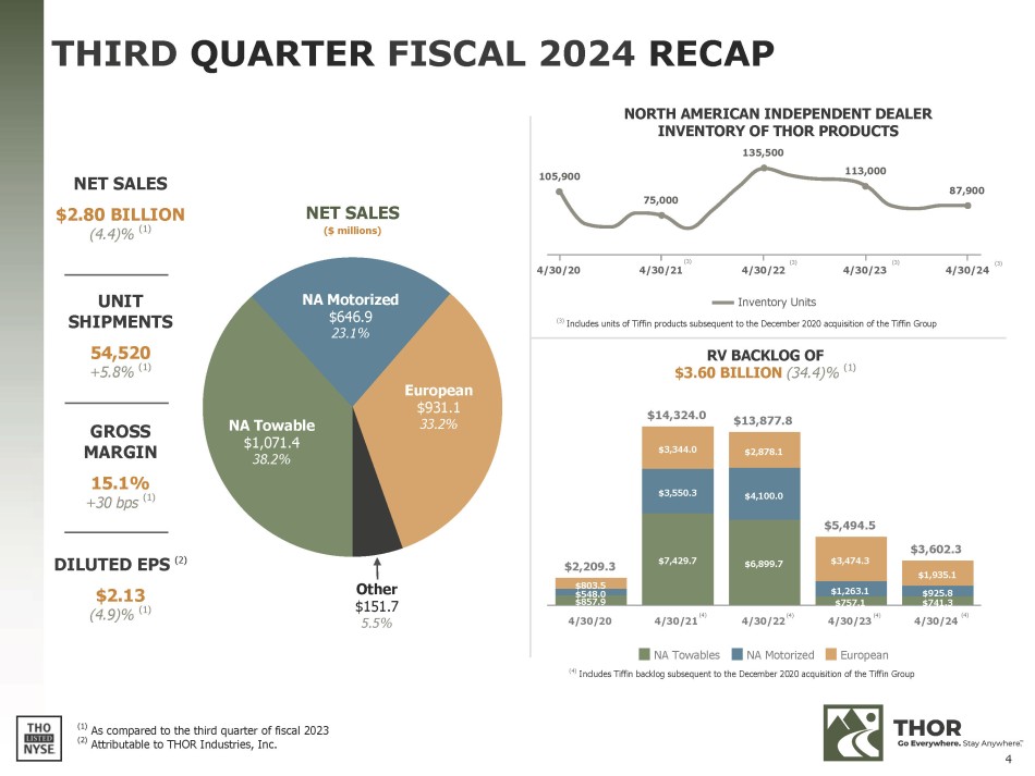 THIRD QUARTER FISCAL 2024 SUMMARY THIRD QUARTER FISCAL 2024 HIGHLIGHTS ▪ Financial performance in line with expectations and reflects efforts to manage the near - term environment while continuing to support independent dealers in managing inventory levels ▪ European segment delivered another strong quarter with year - over - year top line growth and a steady bottom line driven by sustained operational improvements and market share gains ▪ Positioning operating companies and independent dealers for success amidst current macroeconomic headwinds ▪ Production levels appropriately aligned with retail trends ▪ Focus on fresh model year dealer lineups heading into model year 2025 changeover ▪ Dealers remain focused on managing inventory levels as higher interest rates and inflationary pressures persist NET SALES BY SEGMENT NET SALES $2.80B (4.4)% (1) GROSS MARGIN 15.1% +30 bps (1) DILUTED EPS (2) $2.13 (4.9)% (1) Segment Net Sales Net Sales Change (1) North American Towable $1,071.4M (4.7)% North American Motorized $646.9M (18.7)% European $931.1M +7.4% (1) As compared to the third quarter of fiscal 2023 (2) Attributable to THOR Industries, Inc. 3
