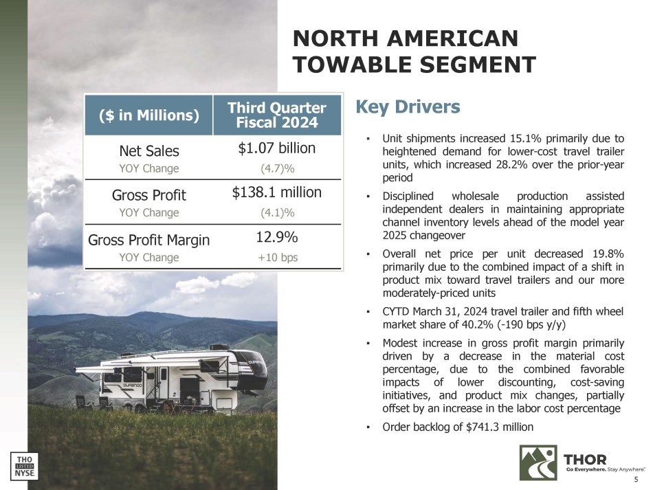 $2,209.3 $14,324.0 $13,877.8 $5,494.5 $3,602.3 $857.9 $7,429.7 $6,899.7 $757.1 $741.3 $548.0 $3,550.3 $4,100.0 $1,263.1 $925.8 $803.5 $3,344.0 $2,878.1 $3,474.3 $1,935.1 4/30/20 4/30/21 4/30/22 4/30/23 4/30/24 European $931.1 33.2% NA Motorized $646.9 23.1% NA Towable $1,071.4 38.2% Other $151.7 5.5% 105,900 75,000 113,000 87,900 4/30/20 NORTH AMERICAN INDEPENDENT DEALER INVENTORY OF THOR PRODUCTS 135,500 RV BACKLOG OF $3.60 BILLION (34.4)% (1) Inventory Units (3) Includes units of Tiffin products subsequent to the December 2020 acquisition of the Tiffin Group NA Towables NA Motorized European (4) Includes Tiffin backlog subsequent to the December 2020 acquisition of the Tiffin Group (3) 4/30/24 (3) 4/30/23 THIRD QUARTER FISCAL 2024 RECAP GROSS MARGIN 15.1% +30 bps (1) DILUTED EPS (2) $2.13 (4.9)% (1) NET SALES $2.80 BILLION (4.4)% (1) (4) (4) (3) 4/30/22 UNIT SHIPMENTS 54,520 +5.8% (1) (1) As compared to the third quarter of fiscal 2023 (2) Attributable to THOR Industries, Inc. 4 (4) (3) 4/30/21 NET SALES ($ millions) (4)