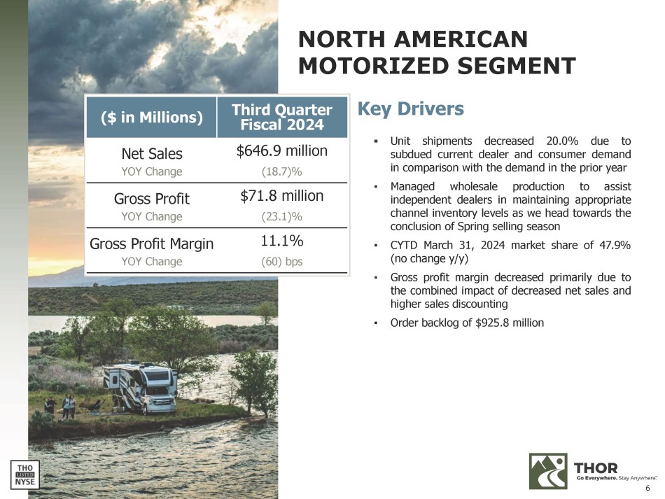 ($ in Millions) Third Quarter Fiscal 2024 Net Sales YOY Change Gross Profit YOY Change Gross Profit Margin YOY Change $1.07 billion (4.7)% $138.1 million (4.1)% 12.9% +10 bps NORTH AMERICAN TOWABLE SEGMENT 5 Key Drivers ▪ Unit shipments increased 15 . 1 % primarily due to heightened demand for lower - cost travel trailer units, which increased 28 . 2 % over the prior - year period ▪ Disciplined wholesale production assisted independent dealers in maintaining appropriate channel inventory levels ahead of the model year 2025 changeover ▪ Overall net price per unit decreased 19 . 8 % primarily due to the combined impact of a shift in product mix toward travel trailers and our more moderately - priced units ▪ CYTD March 31 , 2024 travel trailer and fifth wheel market share of 40 . 2 % ( - 190 bps y/y) ▪ Modest increase in gross profit margin primarily driven by a decrease in the material cost percentage, due to the combined favorable impacts of lower discounting, cost - saving initiatives, and product mix changes, partially offset by an increase in the labor cost percentage ▪ Order backlog of $ 741 . 3 million
