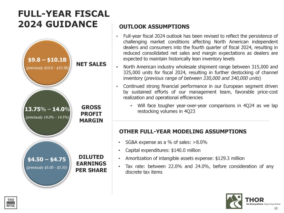 9 CAPITAL MANAGEMENT PRIORITIES AND FISCAL 2024 ACTIONS Invest in THOR’s business ▪ Capex spending of $106.1 million FYTD Pay THOR's dividend ▪ Increased regular quarterly dividend to $0.48 in October 2023 ▪ Represents 14 th consecutive year of dividend increases Reduce the Company's debt obligations ▪ Payments on term - loan credit facilities of $100.0 million for Fiscal Year 2024 (1) ▪ Committed to long - term net debt leverage ratio target of less than 1.0x; currently at 1.2x Repurchase shares on a strategic and opportunistic basis ▪ Repurchased $43.0 million FYTD ▪ $448.2 million available to be repurchased as of April 30, 2024 under current authorizations Support opportunistic strategic investments ( 1 ) Payments exclude the impact of the November 15 , 2023 term loan amendments, as discussed in Note 12 to the Condensed Consolidated Financial Statements of the Company’s Quarterly Report on Form 10 - Q for the period ended April 30 , 2024 .