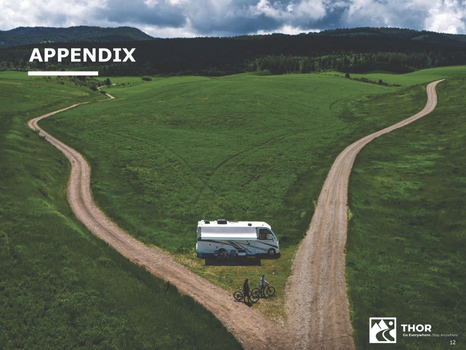 KEY TAKEAWAYS Continue to align production and wholesale shipments to reflect current cautious dealer outlook to position THOR and its North American dealers with appropriate inventories as Spring selling season concludes and we approach the 2025 model year changeover Strong financial performance in our European segment driven by sustained efforts of our management team, favorable price - cost realization, market share gains and a resilient European customer base North American operating companies pursuing initiatives to enhance operations and through - cycle profitability, including brand and footprint rationalization, product portfolio optimization and cost management Full - year fiscal 2024 outlook adjusted, to reflect ongoing macro pressures affecting North American independent dealers and consumers, resulting in reduced consolidated net sales, gross profit margin and EPS expectations as dealers are expected to maintain historically lean inventory levels 11