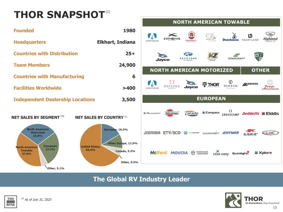 The Global RV Industry Leader THOR SNAPSHOT (1) (1) As of July 31, 2023 Founded 1980 Headquarters Elkhart, Indiana Countries with Distribution 25+ Team Members 24,900 Countries with Manufacturing 6 Facilities Worldwide >400 Independent Dealership Locations 3,500 NET SALES BY SEGMENT (1) NET SALES BY COUNTRY (1) United States, 66.9% Germany, 16.3% Other Europe, 11.0% Canada, 5.3% Other, 0.5% North American Towable 37.8% North American Motorized 29.8% European 27.3% Other, 5.1% EUROPEAN OTHER NORTH AMERICAN MOTORIZED NORTH AMERICAN TOWABLE 13