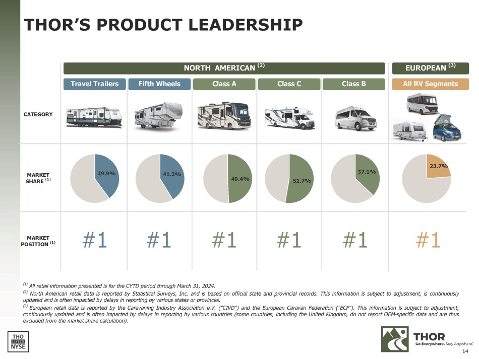 THOR’S PRODUCT LEADERSHIP ( 1 ) All retail information presented is for the CYTD period through March 31 , 2024 . ( 2 ) North American retail data is reported by Statistical Surveys, Inc . and is based on official state and provincial records . This information is subject to adjustment, is continuously updated and is often impacted by delays in reporting by various states or provinces . ( 3 ) European retail data is reported by the Caravaning Industry Association e . V . (“CIVD”) and the European Caravan Federation (“ECF ” ) . This information is subject to adjustment, continuously updated and is often impacted by delays in reporting by various countries (some countries, including the United Kingdom, do not report OEM - specific data and are thus excluded from the market share calculation) . EUROPEAN (3) All RV Segments NORTH AMERICAN (2) CATEGORY Class B Class C Class A Fifth Wheels Travel Trailers 23.7% 37.1% 52.7% 49.4% 41.3% 39.9% MARKET SHARE (1) #1 #1 #1 #1 #1 #1 MARKET POSITION (1) 14