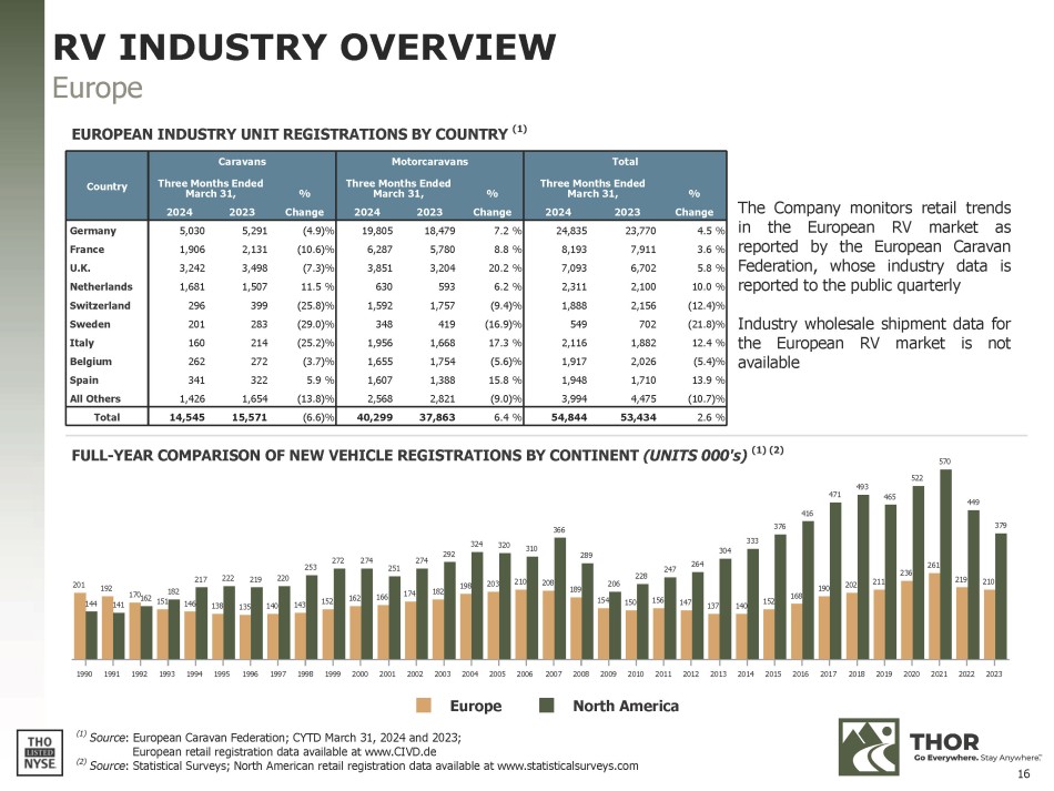 Europe (1) Source : European Caravan Federation; CYTD March 31, 2024 and 2023; European retail registration data available at www.CIVD.de % Change Total Three Months Ended March 31, 2024 2023 % Change Motorcaravans Three Months Ended March 31, 2024 2023 % Change Caravans Three Months Ended March 31, 2024 2023 Country 4.5 % 23,770 24,835 7.2 % 18,479 19,805 (4.9)% 5,291 5,030 Germany 3.6 % 7,911 8,193 8.8 % 5,780 6,287 (10.6)% 2,131 1,906 France 5.8 % 6,702 7,093 20.2 % 3,204 3,851 (7.3)% 3,498 3,242 U.K. 10.0 % 2,100 2,311 6.2 % 593 630 11.5 % 1,507 1,681 Netherlands (12.4)% 2,156 1,888 (9.4)% 1,757 1,592 (25.8)% 399 296 Switzerland (21.8)% 702 549 (16.9)% 419 348 (29.0)% 283 201 Sweden 12.4 % 1,882 2,116 17.3 % 1,668 1,956 (25.2)% 214 160 Italy (5.4)% 2,026 1,917 (5.6)% 1,754 1,655 (3.7)% 272 262 Belgium 13.9 % 1,710 1,948 15.8 % 1,388 1,607 5.9 % 322 341 Spain (10.7)% 4,475 3,994 (9.0)% 2,821 2,568 (13.8)% 1,654 1,426 All Others 2.6 % 53,434 54,844 6.4 % 37,863 40,299 (6.6)% 15,571 14,545 Total The Company monitors retail trends in the European RV market as reported by the European Caravan Federation, whose industry data is reported to the public quarterly Industry wholesale shipment data for the European RV market is not available 201 192 146 138 135 140 143 152 162 166 174 182 198 203 210 208 189 154 150 156 147 137 140 152 168 190 202 211 236 261 219 210 144 141 170 162 151 182 217 222 219 220 253 272 274 251 274 292 324 320 310 366 289 206 228 247 264 304 333 376 416 471 465 522 493 570 449 379 North America 1990 1991 1992 1993 1994 1995 1996 1997 1998 1999 2000 2001 2002 2003 2004 2005 2006 2007 2008 2009 2010 2011 2012 2013 2014 2015 2016 2017 2018 2019 2020 2021 2022 2023 FULL - YEAR COMPARISON OF NEW VEHICLE REGISTRATIONS BY CONTINENT (UNITS 000's) (1) (2) RV INDUSTRY OVERVIEW Europe EUROPEAN INDUSTRY UNIT REGISTRATIONS BY COUNTRY (1) (2) Source : Statistical Surveys; North American retail registration data available at www.statisticalsurveys.com 16