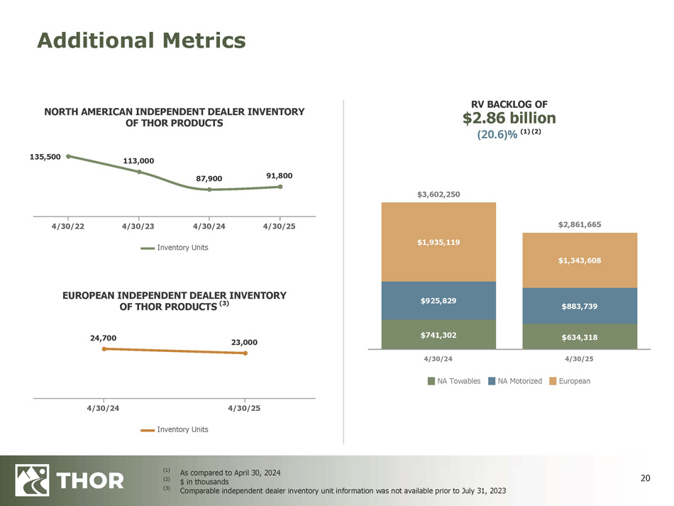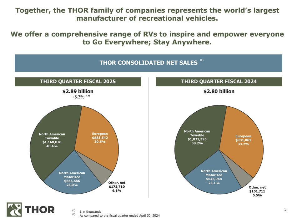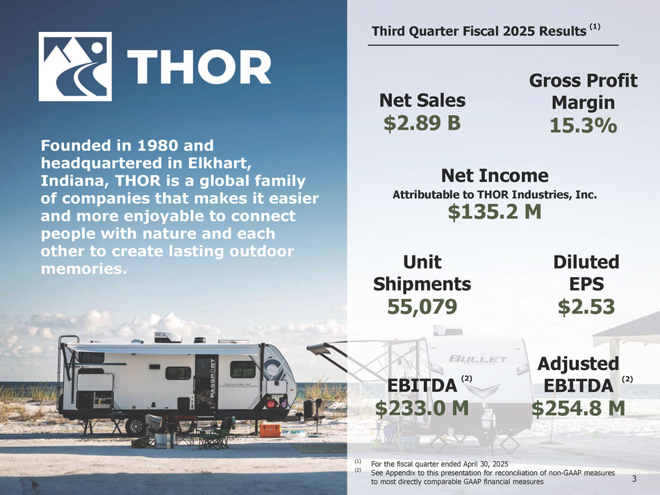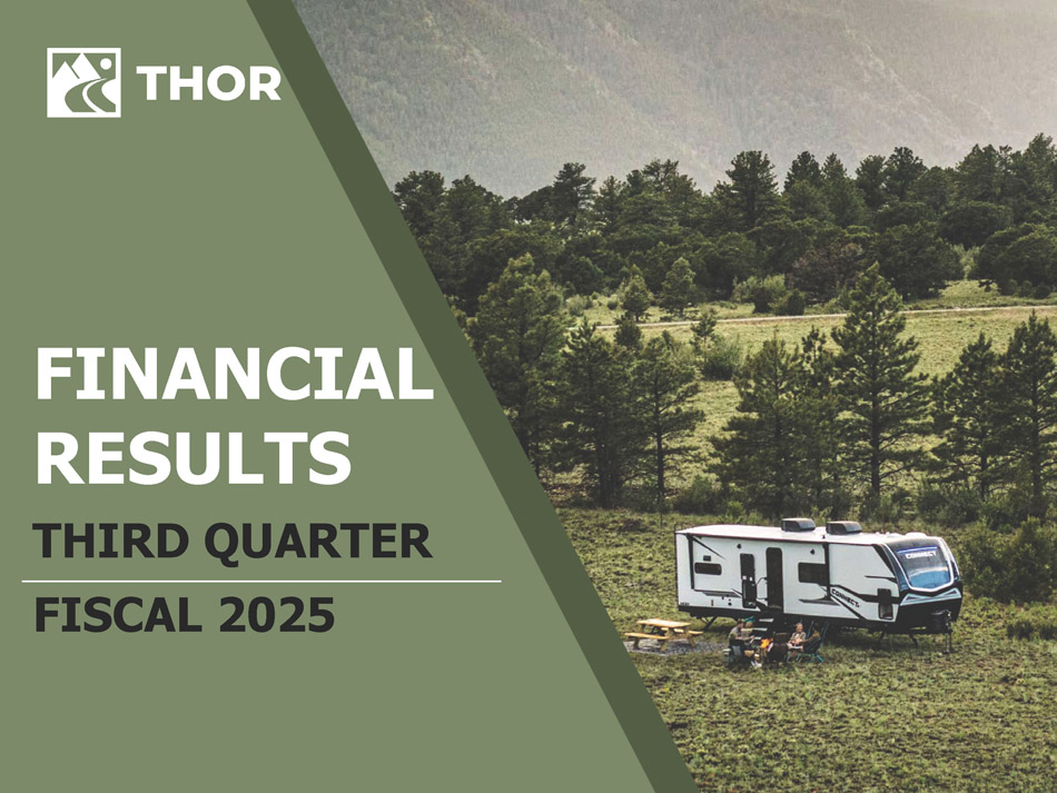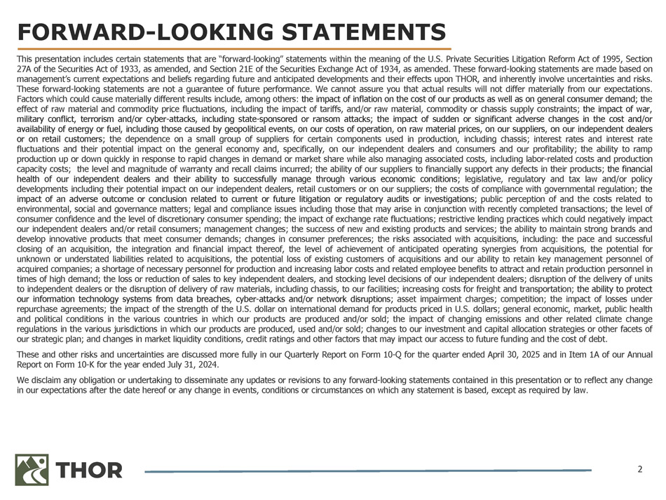 2 FORWARD - LOOKING STATEMENTS This presentation includes certain statements that are “forward - looking” statements within the meaning of the U . S . Private Securities Litigation Reform Act of 1995 , Section 27 A of the Securities Act of 1933 , as amended, and Section 21 E of the Securities Exchange Act of 1934 , as amended . These forward - looking statements are made based on management’s current expectations and beliefs regarding future and anticipated developments and their effects upon THOR, and inherently involve uncertainties and risks . These forward - looking statements are not a guarantee of future performance . We cannot assure you that actual results will not differ materially from our expectations . Factors which could cause materially different results include, among others : the impact of inflation on the cost of our products as well as on general consumer demand ; the effect of raw material and commodity price fluctuations, including the impact of tariffs, and/or raw material, commodity or chassis supply constraints ; the impact of war, military conflict, terrorism and/or cyber - attacks, including state - sponsored or ransom attacks ; the impact of sudden or significant adverse changes in the cost and/or availability of energy or fuel, including those caused by geopolitical events, on our costs of operation, on raw material prices, on our suppliers, on our independent dealers or on retail customers ; the dependence on a small group of suppliers for certain components used in production, including chassis ; interest rates and interest rate fluctuations and their potential impact on the general economy and, specifically, on our independent dealers and consumers and our profitability ; the ability to ramp production up or down quickly in response to rapid changes in demand or market share while also managing associated costs, including labor - related costs and production capacity costs ; the level and magnitude of warranty and recall claims incurred ; the ability of our suppliers to financially support any defects in their products ; the financial health of our independent dealers and their ability to successfully manage through various economic conditions ; legislative, regulatory and tax law and/or policy developments including their potential impact on our independent dealers, retail customers or on our suppliers ; the costs of compliance with governmental regulation ; the impact of an adverse outcome or conclusion related to current or future litigation or regulatory audits or investigations ; public perception of and the costs related to environmental, social and governance matters ; legal and compliance issues including those that may arise in conjunction with recently completed transactions ; the level of consumer confidence and the level of discretionary consumer spending ; the impact of exchange rate fluctuations ; restrictive lending practices which could negatively impact our independent dealers and/or retail consumers ; management changes ; the success of new and existing products and services ; the ability to maintain strong brands and develop innovative products that meet consumer demands ; changes in consumer preferences ; the risks associated with acquisitions, including : the pace and successful closing of an acquisition, the integration and financial impact thereof, the level of achievement of anticipated operating synergies from acquisitions, the potential for unknown or understated liabilities related to acquisitions, the potential loss of existing customers of acquisitions and our ability to retain key management personnel of acquired companies ; a shortage of necessary personnel for production and increasing labor costs and related employee benefits to attract and retain production personnel in times of high demand ; the loss or reduction of sales to key independent dealers, and stocking level decisions of our independent dealers ; disruption of the delivery of units to independent dealers or the disruption of delivery of raw materials, including chassis, to our facilities ; increasing costs for freight and transportation ; the ability to protect our information technology systems from data breaches, cyber - attacks and/or network disruptions ; asset impairment charges ; competition ; the impact of losses under repurchase agreements ; the impact of the strength of the U . S . dollar on international demand for products priced in U . S . dollars ; general economic, market, public health and political conditions in the various countries in which our products are produced and/or sold ; the impact of changing emissions and other related climate change regulations in the various jurisdictions in which our products are produced, used and/or sold ; changes to our investment and capital allocation strategies or other facets of our strategic plan ; and changes in market liquidity conditions, credit ratings and other factors that may impact our access to future funding and the cost of debt . These and other risks and uncertainties are discussed more fully in our Quarterly Report on Form 10 - Q for the quarter ended April 30 , 2025 and in Item 1 A of our Annual Report on Form 10 - K for the year ended July 31 , 2024 . We disclaim any obligation or undertaking to disseminate any updates or revisions to any forward - looking statements contained in this presentation or to reflect any change in our expectations after the date hereof or any change in events, conditions or circumstances on which any statement is based, except as required by law .