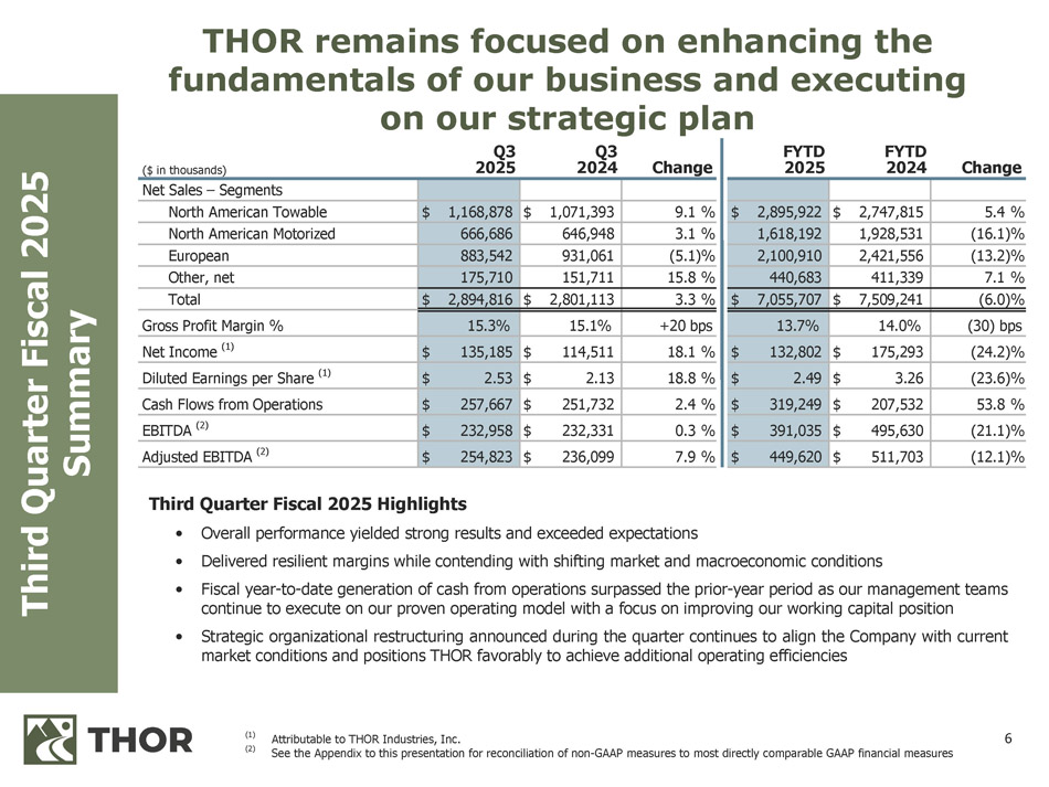 5 Together, the THOR family of companies represents the world’s largest manufacturer of recreational vehicles. We offer a comprehensive range of RVs to inspire and empower everyone to Go Everywhere; Stay Anywhere. Other, net $175,710 6.1% North American Motorized $666,686 23.0% (1) (2) $ in thousands As compared to the fiscal quarter ended April 30, 2024 THOR CONSOLIDATED NET SALES (1) North American Towable $1,168,878 40.4% European $883,542 30.5% Other, net $151,711 5.5% North American Motorized $646,948 23.1% North American Towable $1,071,393 38.2% European $931,061 33.2% THIRD QUARTER FISCAL 2025 THIRD QUARTER FISCAL 2024 $2.80 billion $2.89 billion +3.3% (2)