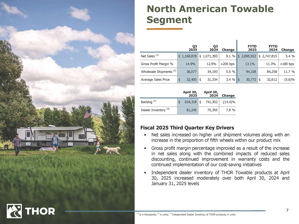 6 ($ in thousands) Q3 2025 Q3 2024 Change Net Sales – Segments 9.1 % $ 1,071,393 $ 1,168,878 North American Towable 3.1 % 646,948 666,686 North American Motorized (5.1)% 931,061 883,542 European 15.8 % 151,711 175,710 Other, net 3.3 % $ 2,801,113 $ 2,894,816 Total +20 bps 15.1% 15.3% Gross Profit Margin % 18.1 % $ 114,511 $ 135,185 Net Income (1) 18.8 % $ 2.13 $ 2.53 Diluted Earnings per Share (1) 2.4 % $ 251,732 $ 257,667 Cash Flows from Operations 0.3 % $ 232,331 $ 232,958 EBITDA (2) 7.9 % $ 236,099 $ 254,823 Adjusted EBITDA (2) FYTD 2025 FYTD 2024 Change 5.4 % $ 2,747,815 $ 2,895,922 (16.1)% 1,928,531 1,618,192 (13.2)% 2,421,556 2,100,910 7.1 % 411,339 440,683 (6.0)% $ 7,509,241 $ 7,055,707 (30) bps 14.0% 13.7% (24.2)% $ 175,293 $ 132,802 (23.6)% $ 3.26 $ 2.49 53.8 % $ 207,532 $ 319,249 (21.1)% $ 495,630 $ 391,035 (12.1)% $ 511,703 $ 449,620 THOR remains focused on enhancing the fundamentals of our business and executing on our strategic plan (1) (2) Attributable to THOR Industries, Inc. See the Appendix to this presentation for reconciliation of non - GAAP measures to most directly comparable GAAP financial measures Third Quarter Fiscal 2025 Summary Third Quarter Fiscal 2025 Highlights • Overall performance yielded strong results and exceeded expectations • Delivered resilient margins while contending with shifting market and macroeconomic conditions • Fiscal year - to - date generation of cash from operations surpassed the prior - year period as our management teams continue to execute on our proven operating model with a focus on improving our working capital position • Strategic organizational restructuring announced during the quarter continues to align the Company with current market conditions and positions THOR favorably to achieve additional operating efficiencies