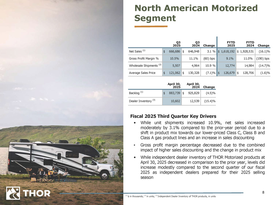 7 Fiscal 2025 Third Quarter Key Drivers • Net sales increased on higher unit shipment volumes along with an increase in the proportion of fifth wheels within our product mix • Gross profit margin percentage improved as a result of the increase in net sales along with the combined impacts of reduced sales discounting, continued improvement in warranty costs and the continued implementation of our cost - saving initiatives • Independent dealer inventory of THOR Towable products at April 30 , 2025 increased moderately over both April 30 , 2024 and January 31 , 2025 levels North American Towable Segment FYTD FYTD Q3 Q3 Change 2024 2025 Change 2024 2025 5.4 % $ 2,747,815 $ 2,895,922 9.1 % $ 1,071,393 $ 1,168,878 Net Sales (1) +180 bps 11.3% 13.1% +200 bps 12.9% 14.9% Gross Profit Margin % 11.7 % 84,258 94,108 5.5 % 34,193 36,077 Wholesale Shipments (2) (5.6)% $ 32,612 $ 30,772 3.4 % $ 31,334 $ 32,400 Average Sales Price April 30, 2025 April 30, 2024 Change (14.4)% $ 741,302 $ 634,318 Backlog (1) 7.8 % 75,355 81,245 Dealer Inventory (3) (1) $ in thousands; (2) in units; (3) Independent Dealer Inventory of THOR products, in units