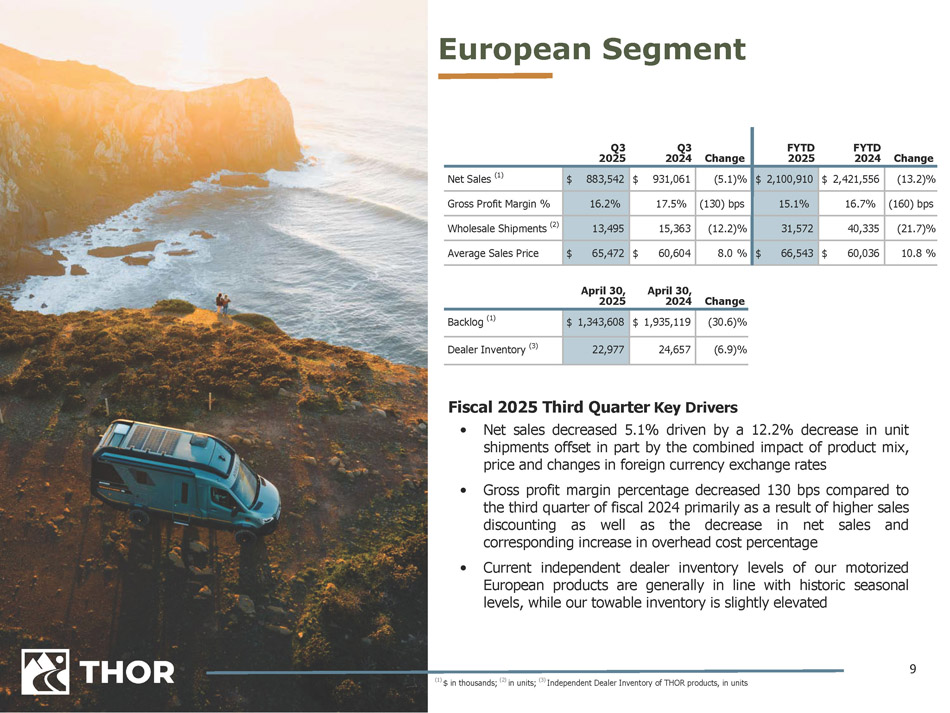 8 North American Motorized Segment Fiscal 2025 Third Quarter Key Drivers • While unit shipments increased 10 . 9 % , net sales increased moderately by 3 . 1 % compared to the prior - year period due to a shift in product mix towards our lower - priced Class C, Class B and Class A gas product lines and an increase in sales discounting • Gross profit margin percentage decreased due to the combined impact of higher sales discounting and the change in product mix • While independent dealer inventory of THOR Motorized products at April 30 , 2025 decreased in comparison to the prior year, levels did increase modestly compared to the second quarter of our fiscal 2025 as independent dealers prepared for their 2025 selling season FYTD FYTD Q3 Q3 Change 2024 2025 Change 2024 2025 (16.1)% $ 1,928,531 $ 1,618,192 3.1 % $ 646,948 $ 666,686 Net Sales (1) (190) bps 11.0% 9.1% (60) bps 11.1% 10.5% Gross Profit Margin % (14.7)% 14,984 12,774 10.9 % 4,964 5,507 Wholesale Shipments (2) (1.6)% $ 128,706 $ 126,679 (7.1)% $ 130,328 $ 121,062 Average Sales Price April 30, 2025 April 30, 2024 Change (4.5)% $ 925,829 $ 883,739 Backlog (1) (15.4)% 12,539 10,602 Dealer Inventory (3) (1) $ in thousands; (2) in units; (3) Independent Dealer Inventory of THOR products, in units