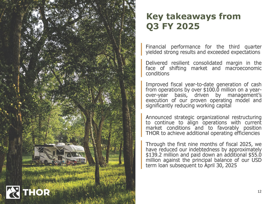 11 Capital Management PRIORITIES AND FISCAL 2025 ACTIONS Invest in THOR’s business ▪ Capex investment of $ 85 . 1 million FYTD Pay THOR's dividend (1) ▪ Increased regular quarterly dividend to $0.50 in October 2024 ▪ Represents 15 th consecutive year of dividend increases Reduce the Company's debt obligations ▪ Payments on total debt of $ 139 . 2 million FYTD ▪ Subsequent to April 30 , 2025 , THOR paid down an additional $ 55 . 0 million towards the principal of its USD term loan debt ▪ Committed to long - term net debt leverage ratio target of 1 . 0 x Repurchase shares on a strategic and opportunistic basis ▪ $ 421 . 1 million available to be repurchased under current authorizations as of April 30 , 2025 Support opportunistic strategic investments ▪ Strong cash flows favorably position THOR to seize upon opportunities in both North America and Europe (1) Our Board currently intends to continue regular quarterly cash dividend payments in the future, subject to certain conditions discussed in the Liquidity and Capital Resources section of Item II : Management’s Discussion and Analysis in the Company’s Quarterly Report on Form 10 - Q for the period ended April 30 , 2025