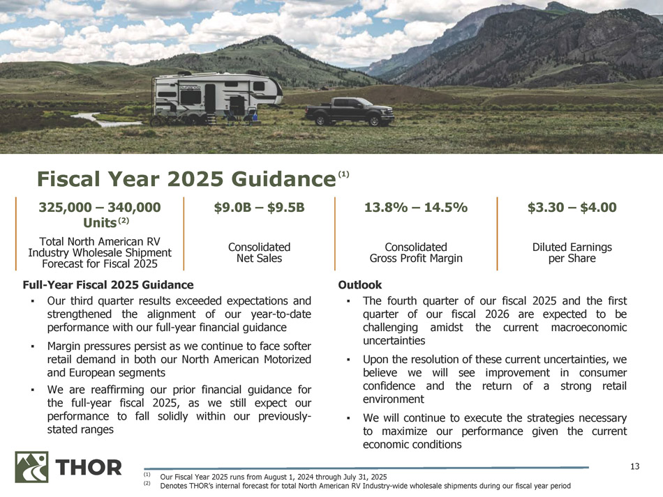 12 Financial performance for the third quarter yielded strong results and exceeded expectations Delivered resilient consolidated margin in the face of shifting market and macroeconomic conditions Improved fiscal year - to - date generation of cash from operations by over $ 100 . 0 million on a year - over - year basis, driven by management’s execution of our proven operating model and significantly reducing working capital Announced strategic organizational restructuring to continue to align operations with current market conditions and to favorably position THOR to achieve additional operating efficiencies Through the first nine months of fiscal 2025 , we have reduced our indebtedness by approximately $ 139 . 2 million and paid down an additional $ 55 . 0 million against the principal balance of our USD term loan subsequent to April 30 , 2025 Key takeaways from Q3 FY 2025