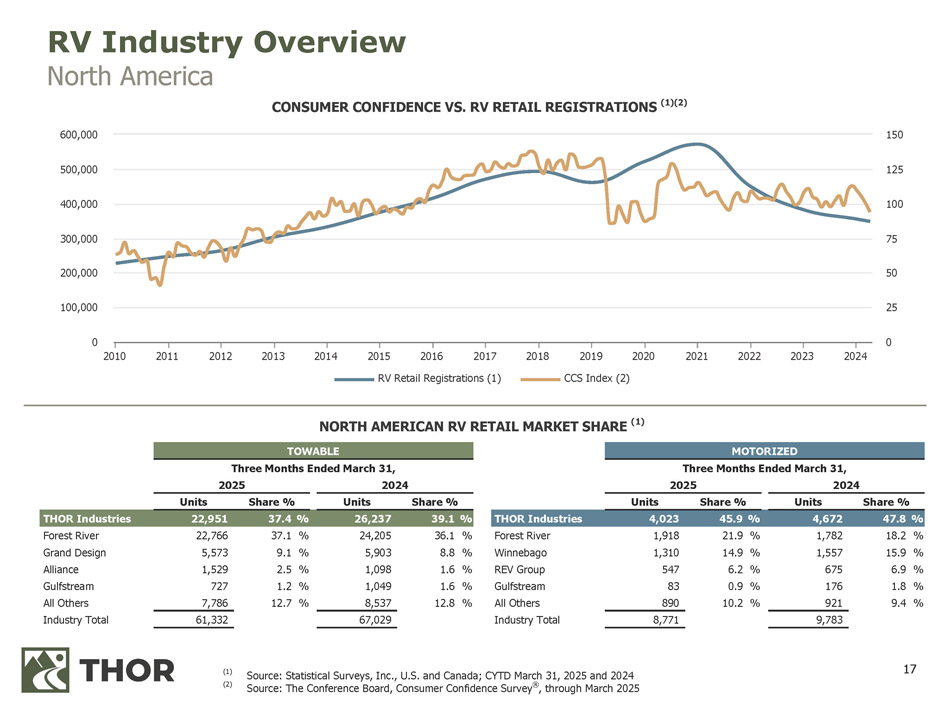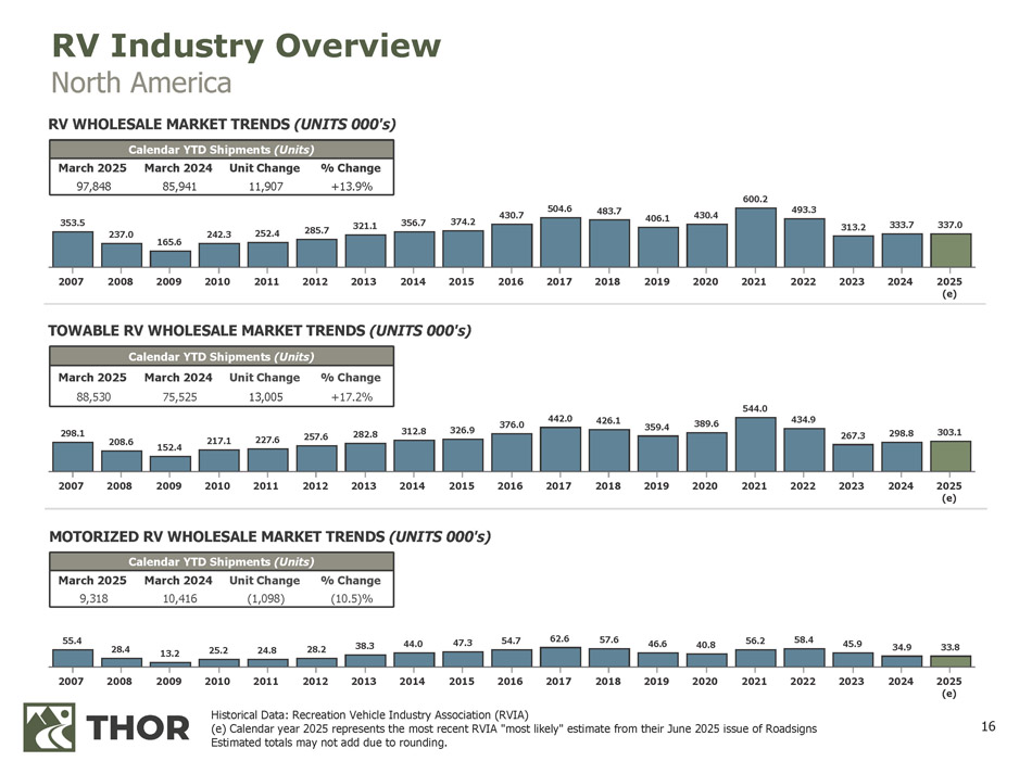 16 55.4 28.4 13.2 25.2 24.8 28.2 38.3 44.0 47.3 54.7 62.6 57.6 46.6 40.8 56.2 58.4 45.9 34.9 33.8 2007 2008 2009 2010 2011 2012 2013 2014 2015 2016 2017 2018 2019 2020 2021 2022 2023 2024 2025 (e) 298.1 208.6 152.4 217.1 227.6 257.6 282.8 312.8 326.9 376.0 442.0 426.1 359.4 389.6 544.0 434.9 267.3 298.8 303.1 2007 2008 2009 2010 2011 2012 2013 2014 2015 2016 2017 2018 2019 2020 2021 2022 2023 2024 2025 (e) 353.5 237.0 165.6 242.3 252.4 285.7 321.1 356.7 374.2 430.7 504.6 483.7 406.1 430.4 600.2 493.3 313.2 333.7 337.0 2007 2008 2009 2010 2011 2012 2013 2014 2015 2016 2017 2018 2019 2020 2021 2022 2023 2024 2025 (e) TOWABLE RV WHOLESALE MARKET TRENDS (UNITS 000's) Calendar YTD Shipments (Units) % Change Unit Change March 2024 March 2025 +13.9% 11,907 85,941 97,848 Calendar YTD Shipments (Units) % Change Unit Change March 2024 March 2025 +17.2% 13,005 75,525 88,530 Calendar YTD Shipments (Units) % Change Unit Change March 2024 March 2025 (10.5)% (1,098) 10,416 9,318 Historical Data: Recreation Vehicle Industry Association (RVIA) (e) Calendar year 2025 represents the most recent RVIA "most likely" estimate from their June 2025 issue of Roadsigns Estimated totals may not add due to rounding. RV Industry Overview North America RV WHOLESALE MARKET TRENDS (UNITS 000's) MOTORIZED RV WHOLESALE MARKET TRENDS (UNITS 000's)