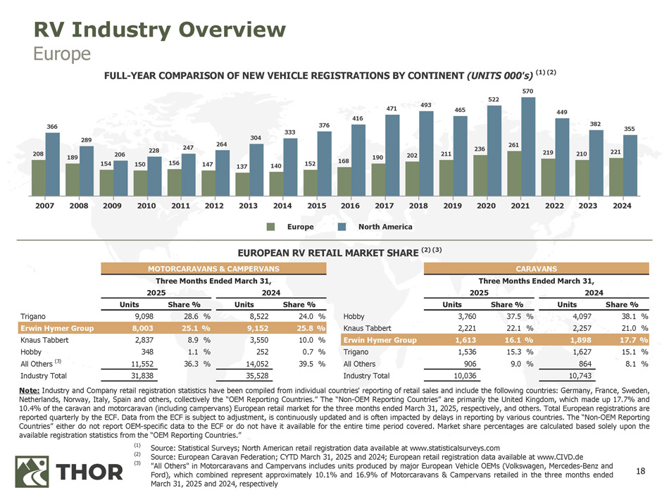 17 RV Industry Overview North America CONSUMER CONFIDENCE VS. RV RETAIL REGISTRATIONS (1)(2) NORTH AMERICAN RV RETAIL MARKET SHARE (1) 2015 2016 2017 RV Retail Registrations (1) CCS Index (2) 2010 2011 2012 2013 2014 2018 2019 2020 2021 2022 2023 2024 0 100,000 200,000 300,000 400,000 500,000 600,000 0 25 50 75 100 125 150 (1) (2) Source: Statistical Surveys, Inc., U.S. and Canada; CYTD March 31, 2025 and 2024 Source: The Conference Board, Consumer Confidence Survey ® , through March 2025 47.8 % 4,672 45.9 % 4,023 THOR Industries 39.1 % 26,237 37.4 % 22,951 THOR Industries % 18.2 1,782 % 21.9 1,918 Forest River % 36.1 24,205 % 37.1 22,766 Forest River % 15.9 1,557 % 14.9 1,310 Winnebago % 8.8 5,903 % 9.1 5,573 Grand Design % 6.9 675 % 6.2 547 REV Group % 1.6 1,098 % 2.5 1,529 Alliance % 1.8 176 % 0.9 83 Gulfstream % 1.6 1,049 % 1.2 727 Gulfstream % 9.4 921 % 10.2 890 All Others % 12.8 8,537 % 12.7 7,786 All Others 9,783 8,771 Industry Total 67,029 61,332 Industry Total TOWABLE Three Months Ended March 31, 2025 2024 Share % Units Units Share % MOTORIZED Three Months Ended March 31, 2025 2024 Share % Units Units Share %