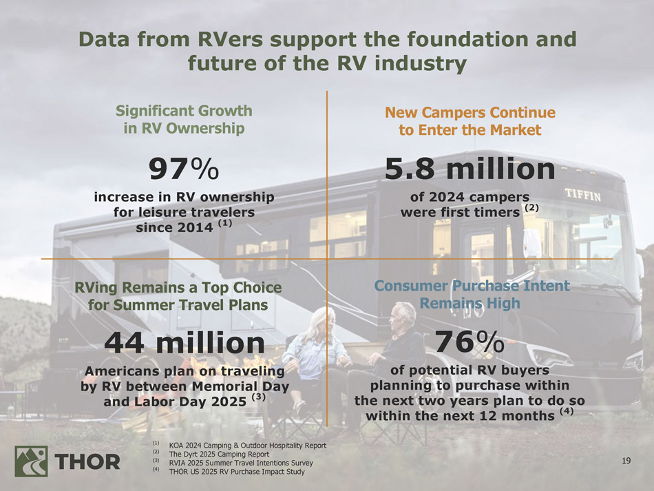 18 EUROPEAN RV RETAIL MARKET SHARE (2) (3) 208 189 154 150 156 147 137 140 152 168 190 202 211 236 261 219 210 221 366 289 206 228 247 264 304 333 376 416 471 493 465 449 382 355 Europe North America 2007 2008 2009 2010 2011 2012 2013 2014 2015 2016 2017 2018 2019 2020 2021 2022 2023 2024 (1) (2) (3) Source : Statistical Surveys ; North American retail registration data available at www . statisticalsurveys . com Source : European Caravan Federation ; CYTD March 31 , 2025 and 2024 ; European retail registration data available at www . CIVD . de "All Others" in Motorcaravans and Campervans includes units produced by major European Vehicle OEMs (Volkswagen, Mercedes - Benz and Ford), which combined represent approximately 10 . 1 % and 16 . 9 % of Motorcaravans & Campervans retailed in the three months ended March 31 , 2025 and 2024 , respectively RV Industry Overview Europe FULL - YEAR COMPARISON OF NEW VEHICLE REGISTRATIONS BY CONTINENT (UNITS 000's) (1) (2) 570 522 CARAVANS Units Three Months Ended March 31, 2025 2024 Share % Units Share % MOTORCARAVANS & CAMPERVANS Units Three Months Ended March 31, 2025 2024 Share % Units Share % 38.1 % 4,097 37.5 % 3,760 Hobby 24.0 % 8,522 28.6 % 9,098 Trigano 21.0 % 2,257 22.1 % 2,221 Knaus Tabbert 25.8 % 9,152 25.1 % 8,003 Erwin Hymer Group 17.7 % 1,898 16.1 % 1,613 Erwin Hymer Group 10.0 % 3,550 8.9 % 2,837 Knaus Tabbert 15.1 % 1,627 15.3 % 1,536 Trigano 0.7 % 252 1.1 % 348 Hobby 8.1 % 864 9.0 % 906 All Others 39.5 % 14,052 36.3 % 11,552 All Others (3) 10,743 10,036 Industry Total 35,528 31,838 Industry Total Note : Industry and Company retail registration statistics have been compiled from individual countries' reporting of retail sales and include the following countries : Germany, France, Sweden, Netherlands, Norway, Italy, Spain and others, collectively the “OEM Reporting Countries . ” The “Non - OEM Reporting Countries” are primarily the United Kingdom, which made up 17 . 7 % and 10 . 4 % of the caravan and motorcaravan (including campervans) European retail market for the three months ended March 31 , 2025 , respectively, and others . Total European registrations are reported quarterly by the ECF . Data from the ECF is subject to adjustment, is continuously updated and is often impacted by delays in reporting by various countries . The “Non - OEM Reporting Countries” either do not report OEM - specific data to the ECF or do not have it available for the entire time period covered . Market share percentages are calculated based solely upon the available registration statistics from the “OEM Reporting Countries . ”