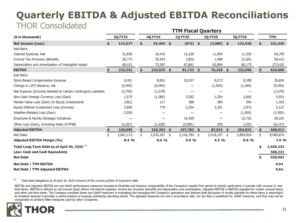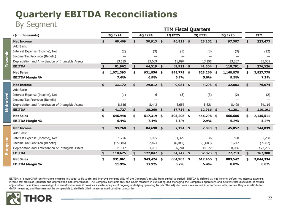 EBITDA and Adjusted EBITDA are non - GAAP performance measures included to illustrate and improve comparability of the Company's results from period to period, particularly in periods with unusual or one - time items . EBITDA is defined as net income (loss) before net interest expense, income tax provision (benefit) and depreciation and amortization . Adjusted EBITDA is EBITDA adjusted for certain unusual items and other one - time items . The Company considers these non - GAAP measures in evaluating and managing the Company's operations and believes that discussion of results adjusted for these items is meaningful to investors because it provides a useful analysis of ongoing underlying operating trends . The adjusted measures are not in accordance with, nor are they a substitute for, GAAP measures, and they may not be comparable to similarly titled measures used by other companies . 21 Quarterly EBITDA & Adjusted EBITDA Reconciliations THOR Consolidated TTM 3Q FY25 2Q FY25 1Q FY25 4Q FY24 3Q FY24 ($ in thousands) $ 221,430 $ 133,928 $ (3,089) $ (873) $ 91,464 $ 113,577 Net Income (Loss) 56,793 11,205 11,950 15,228 18,410 21,830 Add Back: Interest Expense, Net 58,412 21,652 1,489 (283) 35,554 28,773 Income Tax Provision (Benefit) 273,425 66,173 65,994 67,661 73,597 68,151 Depreciation and Amortization of Intangible Assets $ 610,060 $ 232,958 $ 76,344 $ 81,733 $ 219,025 $ 232,331 EBITDA 35,650 8,188 8,073 10,537 8,852 9,351 Add Back: Stock - Based Compensation Expense (9,394) (1,400) (1,500) — (6,494) (5,000) Change in LIFO Reserve, net (1,079) — — — (1,079) (2,700) Net Expense (Income) Related to Certain Contingent Liabilities 5,931 2,665 1,254 3,392 (1,380) 1,575 Non - Cash Foreign Currency Loss (Gain) 1,183 294 384 388 117 (581) Market Value Loss (Gain) on Equity Investments 5,127 (157) 2,251 2,254 779 2,890 Equity Method Investment Loss (Income) (1,500) (1,500) — — — 2,500 Weather - Related Loss (Gain) 28,181 12,722 — 15,459 — — Employee & Facility Strategic Initiatives (6,147) 1,053 209 (5,981) (1,428) (4,267) Other Loss (Gain), Including Sales of PP&E $ 668,012 $ 254,823 $ 87,015 $ 107,782 $ 218,392 $ 236,099 Adjusted EBITDA $ 9,589,874 $ 2,894,816 $ 2,018,107 $ 2,142,784 $ 2,534,167 $ 2,801,113 Net Sales 7.0 % 8.8 % 4.3 % 5.0 % 8.6 % 8.4 % Adjusted EBITDA Margin (%) $ 1,029,223 Total Long - Term Debt as of April 30, 2025 (1) 508,321 Less: Cash and Cash Equivalents $ 520,902 Net Debt 0.9 x 0.8 x Net Debt / TTM EBITDA Net Debt / TTM Adjusted EBITDA TTM Fiscal Quarters (1) Total debt obligations as of April 30, 2025 inclusive of the current portion of long - term debt.