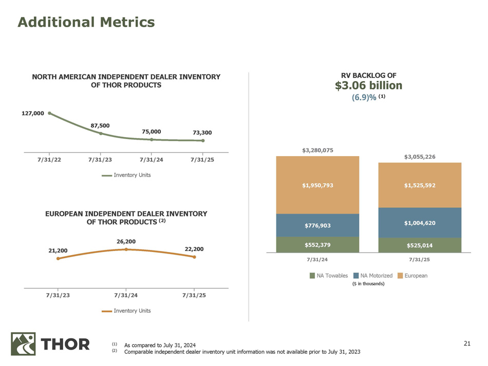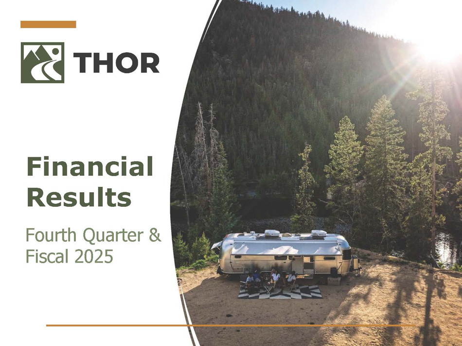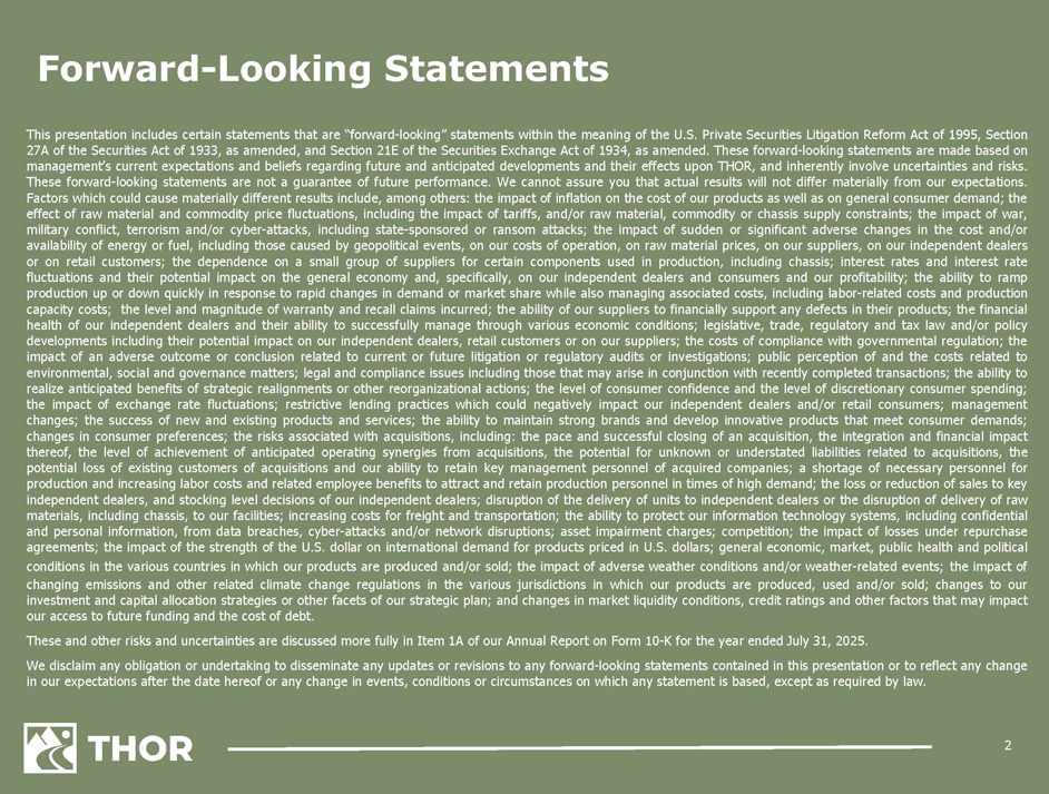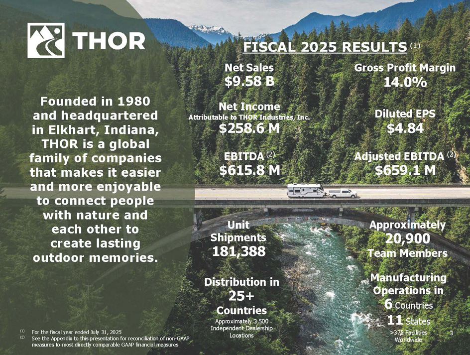 2 Forward - Looking Statements This presentation includes certain statements that are “forward - looking” statements within the meaning of the U . S . Private Securities Litigation Reform Act of 1995 , Section 27 A of the Securities Act of 1933 , as amended, and Section 21 E of the Securities Exchange Act of 1934 , as amended . These forward - looking statements are made based on management’s current expectations and beliefs regarding future and anticipated developments and their effects upon THOR, and inherently involve uncertainties and risks . These forward - looking statements are not a guarantee of future performance . We cannot assure you that actual results will not differ materially from our expectations . Factors which could cause materially different results include, among others : the impact of inflation on the cost of our products as well as on general consumer demand ; the effect of raw material and commodity price fluctuations, including the impact of tariffs, and/or raw material, commodity or chassis supply constraints ; the impact of war, military conflict, terrorism and/or cyber - attacks, including state - sponsored or ransom attacks ; the impact of sudden or significant adverse changes in the cost and/or availability of energy or fuel, including those caused by geopolitical events, on our costs of operation, on raw material prices, on our suppliers, on our independent dealers or on retail customers ; the dependence on a small group of suppliers for certain components used in production, including chassis ; interest rates and interest rate fluctuations and their potential impact on the general economy and, specifically, on our independent dealers and consumers and our profitability ; the ability to ramp production up or down quickly in response to rapid changes in demand or market share while also managing associated costs, including labor - related costs and production capacity costs ; the level and magnitude of warranty and recall claims incurred ; the ability of our suppliers to financially support any defects in their products ; the financial health of our independent dealers and their ability to successfully manage through various economic conditions ; legislative, trade, regulatory and tax law and/or policy developments including their potential impact on our independent dealers, retail customers or on our suppliers ; the costs of compliance with governmental regulation ; the impact of an adverse outcome or conclusion related to current or future litigation or regulatory audits or investigations ; public perception of and the costs related to environmental, social and governance matters ; legal and compliance issues including those that may arise in conjunction with recently completed transactions ; the ability to realize anticipated benefits of strategic realignments or other reorganizational actions ; the level of consumer confidence and the level of discretionary consumer spending ; the impact of exchange rate fluctuations ; restrictive lending practices which could negatively impact our independent dealers and/or retail consumers ; management changes ; the success of new and existing products and services ; the ability to maintain strong brands and develop innovative products that meet consumer demands ; changes in consumer preferences ; the risks associated with acquisitions, including : the pace and successful closing of an acquisition, the integration and financial impact thereof, the level of achievement of anticipated operating synergies from acquisitions, the potential for unknown or understated liabilities related to acquisitions, the potential loss of existing customers of acquisitions and our ability to retain key management personnel of acquired companies ; a shortage of necessary personnel for production and increasing labor costs and related employee benefits to attract and retain production personnel in times of high demand ; the loss or reduction of sales to key independent dealers, and stocking level decisions of our independent dealers ; disruption of the delivery of units to independent dealers or the disruption of delivery of raw materials, including chassis, to our facilities ; increasing costs for freight and transportation ; the ability to protect our information technology systems, including confidential and personal information, from data breaches, cyber - attacks and/or network disruptions ; asset impairment charges ; competition ; the impact of losses under repurchase agreements ; the impact of the strength of the U . S . dollar on international demand for products priced in U . S . dollars ; general economic, market, public health and political conditions in the various countries in which our products are produced and/or sold ; the impact of adverse weather conditions and/or weather - related events ; the impact of changing emissions and other related climate change regulations in the various jurisdictions in which our products are produced, used and/or sold ; changes to our investment and capital allocation strategies or other facets of our strategic plan ; and changes in market liquidity conditions, credit ratings and other factors that may impact our access to future funding and the cost of debt . These and other risks and uncertainties are discussed more fully in Item 1 A of our Annual Report on Form 10 - K for the year ended July 31 , 2025 . We disclaim any obligation or undertaking to disseminate any updates or revisions to any forward - looking statements contained in this presentation or to reflect any change in our expectations after the date hereof or any change in events, conditions or circumstances on which any statement is based, except as required by law .