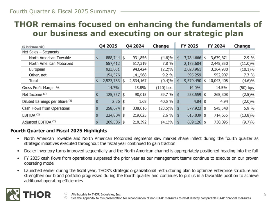 4 Together, the THOR family of companies represents the world’s largest manufacturer of recreational vehicles. We offer a comprehensive range of RVs to inspire and empower everyone to Go Everywhere; Stay Anywhere. (1) (2) $ in thousands As compared to the fiscal quarter ended July 31, 2024 Other, net $154,576 6.1% North American Motorized $557,412 22.1% North American Towable $888,744 35.2% European $923,051 36.6% FOURTH QUARTER FISCAL 2025 $2.52 billion (0.4)% (2) North American Motorized $517,319 20.4% Other, net $141,568 5.6% North American Towable $931,856 36.8% European $943,424 37.2% FOURTH QUARTER FISCAL 2024 $2.53 billion THOR CONSOLIDATED NET SALES (1)